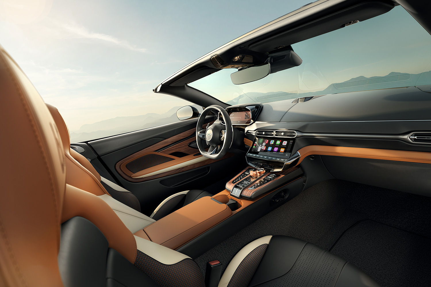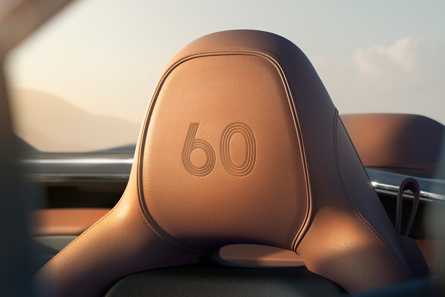 一方車内は、3色の特別配色で、センテナリーサドルタンとアイボリー、ウーブンレザーが完璧なバランスを実現。ダークウォルナット・オープンポアのべニア、ブロンズのアクセント、専用の60th Anniversaryの刺繍、刻印と象嵌を施したシートバックと共に、洗練されたエレガンスとウルトラ・ラグジュアリーを生み出している。