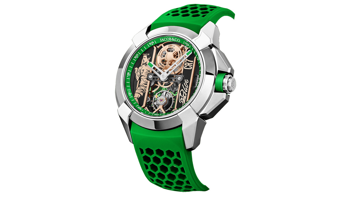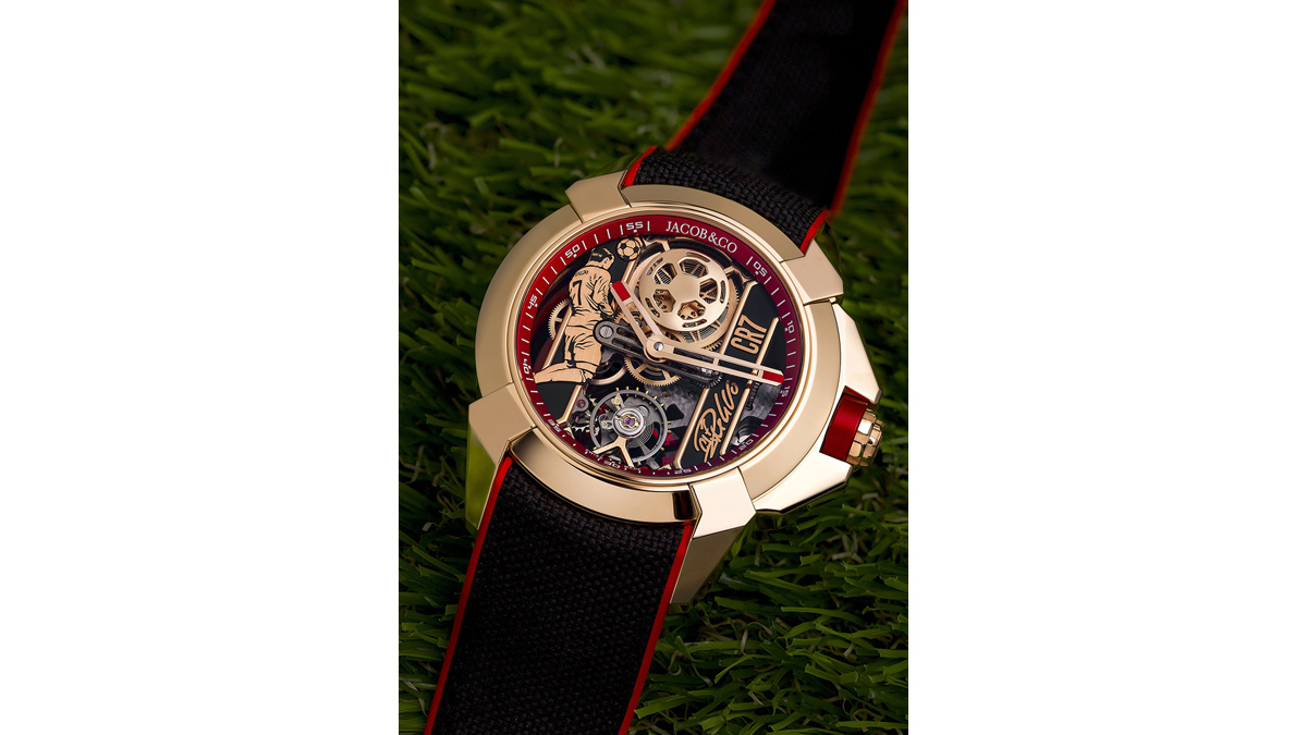 カラーバリエーションは、赤×ローズゴールドの「Flight of CR7」と、緑×ステンレススティールの「Heart of CR7」。これはポルトガル国旗の赤と緑を意識したカラーであり、赤はマンチェスター・ユナイテッドや代表ユニフォームを想起させ、情熱とクラブキャリアを象徴する。