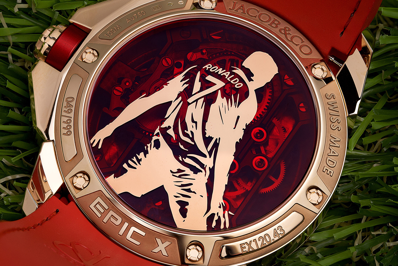 ベースとなるのは、ラグジュアリーを極めたエピックX ブリッジ。象徴的なXの骨格に、ロナウドの個性とサッカー界のアイコンとしての存在感が重なる。縦ブリッジには、従来のクル・ド・パリ装飾に代わり、ロナウドのサインや「CR7」のロゴ、そして彼自身のシルエットが彫刻され、構造そのものが彼の象徴となった。香箱にはサッカーボールの意匠が施され、ムーブメントの鼓動とともに、彼の原点である情熱が静かに息づく。さらに裏蓋には、ゴール後の象徴的なポーズがプリントされ、所有者だけが味わえる特別な物語を刻む。