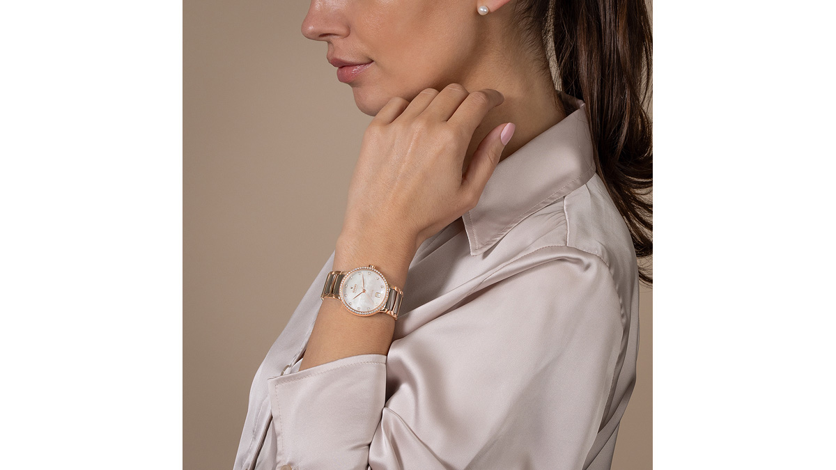 ケース、リュウズ、針、ブレスレットにはローズゴールドを採用し、モダンな印象を際立たせるカラーリングが特徴。