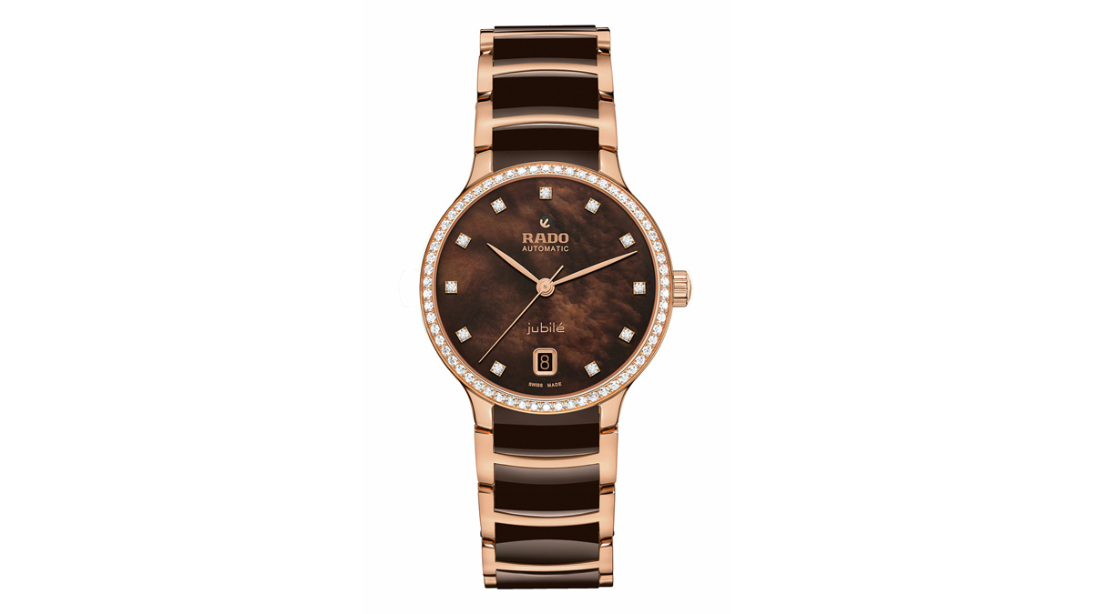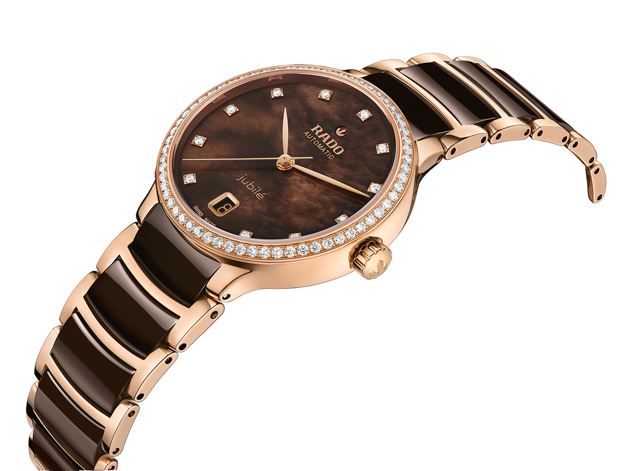 ブレスレットはダイヤルとの調和も意識したデザインで、ブラウンダイヤルにはポリッシュ仕上げのハイテクセラミック製ミドルリンクを、ライトシルバーダイヤルにはラドーが誇るプラズマハイテクセラミック製ミドルリンクを採用した。