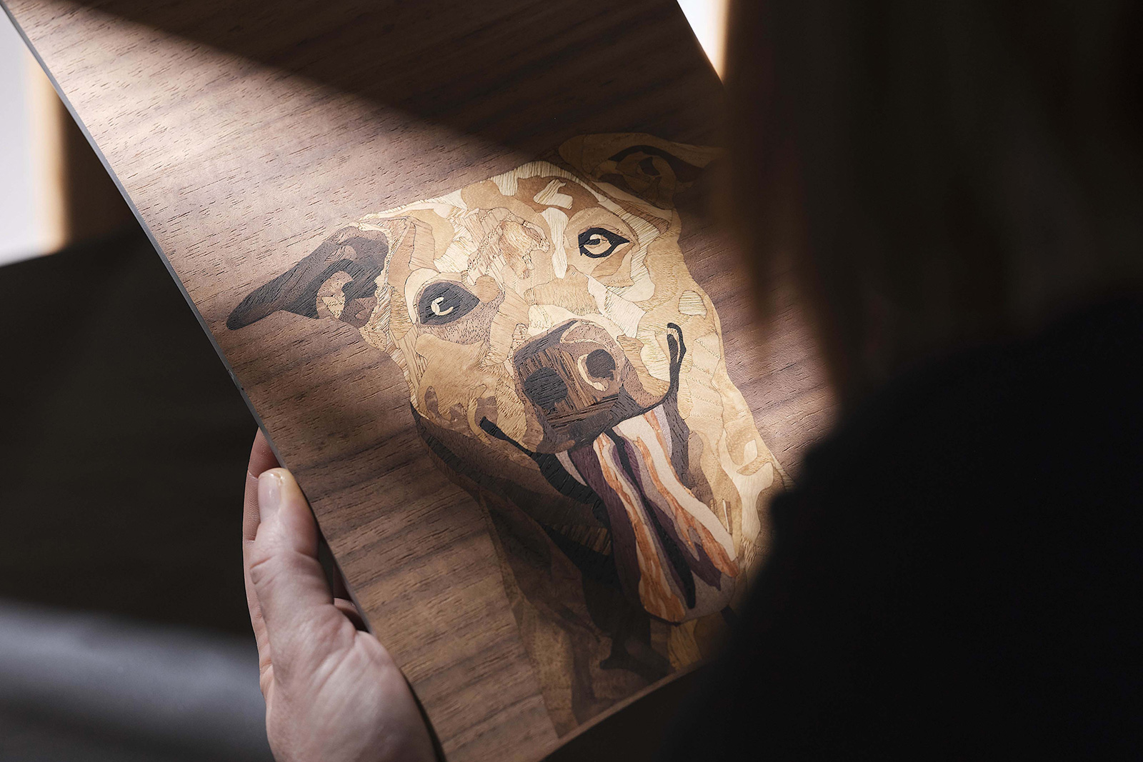 インテリアの中心となるのは、後部座席の間のウォーターフォールに配された、生き生きとしたベイリーの姿を描いた寄木細工の肖像。この精巧なアートワークは完成までに4か月以上を要し、180枚を超えるベニヤを組み合わせて製作された。ベイリーの毛並みの温もりと質感を表現するため、職人たちは多種多様な天然のベニヤを探究し、木目の方向、色調、質感を組み合わせて試行を重ねた。
