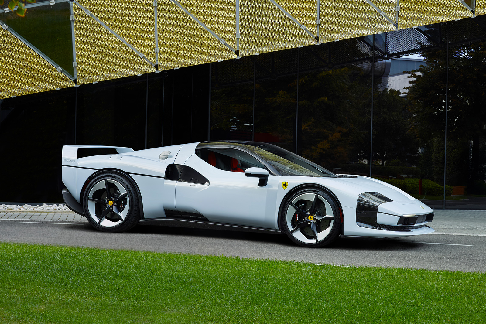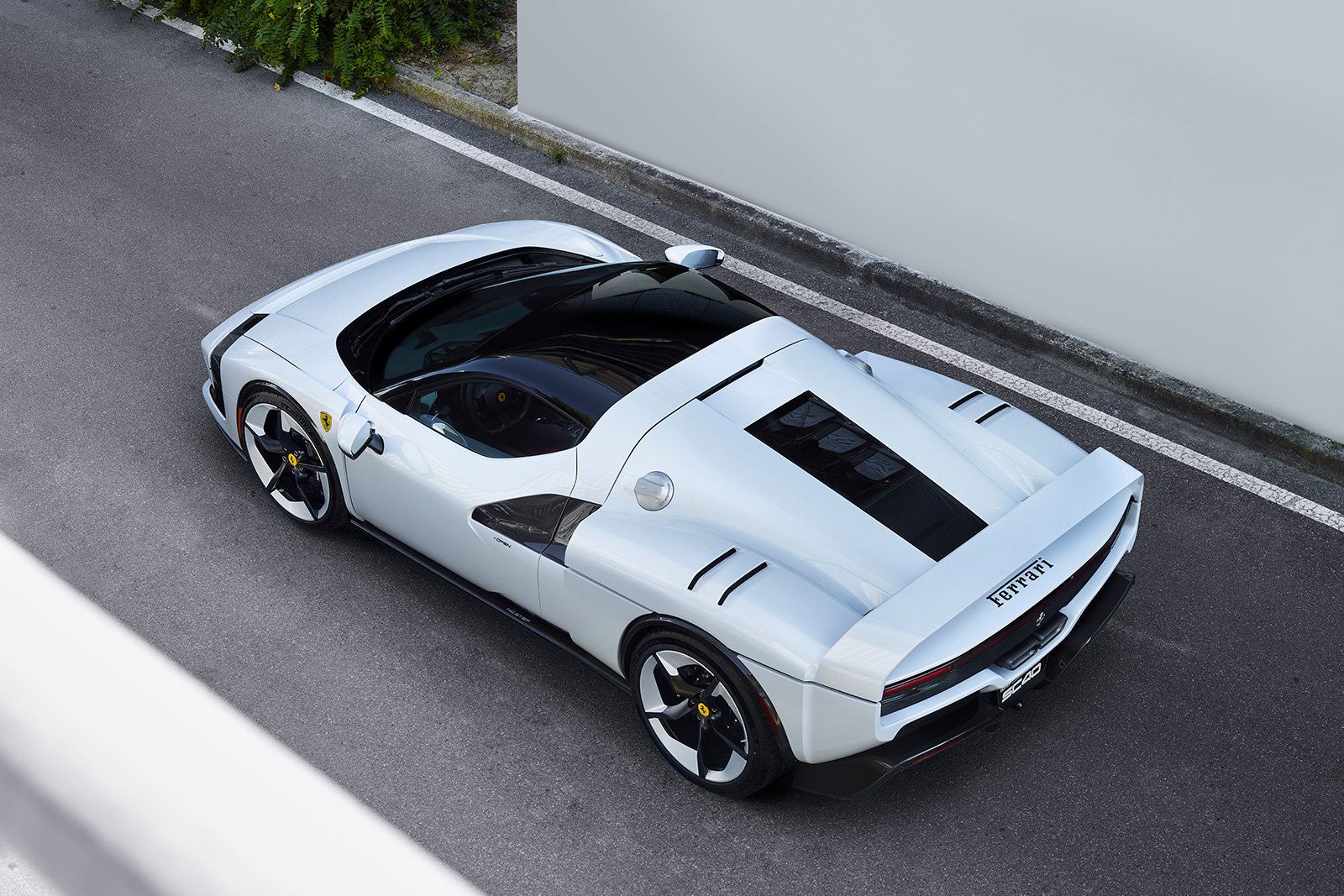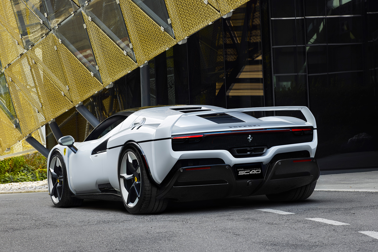 外装色SC40ホワイトは、このモデル専用に開発されたもので、太陽光の下でボディの曲線美を際立たせ、インテリアのカーボン・ケブラー素材を想起させるクールな色調を持つ。SC40ロゴは、車体右側のみに配置。燃料および充電キャップは、ブラッシュ仕上げのアルミ製で、リアエンジンカバーには逆彫りでFerraiロゴが配され、カーボン地が透けるデザインになっている。また専用デザインのホイールは、ダイヤモンドカットのブラッシュメタルとブラックスポークを組み合わせ、幾何学的な造形を強調している。