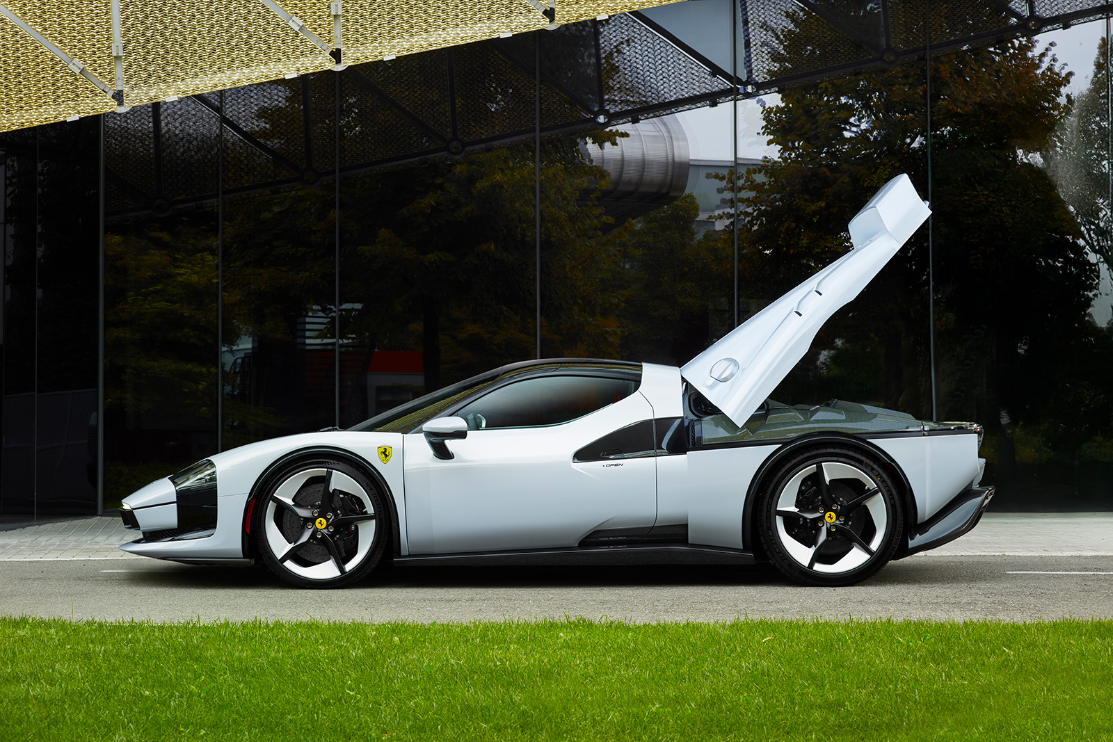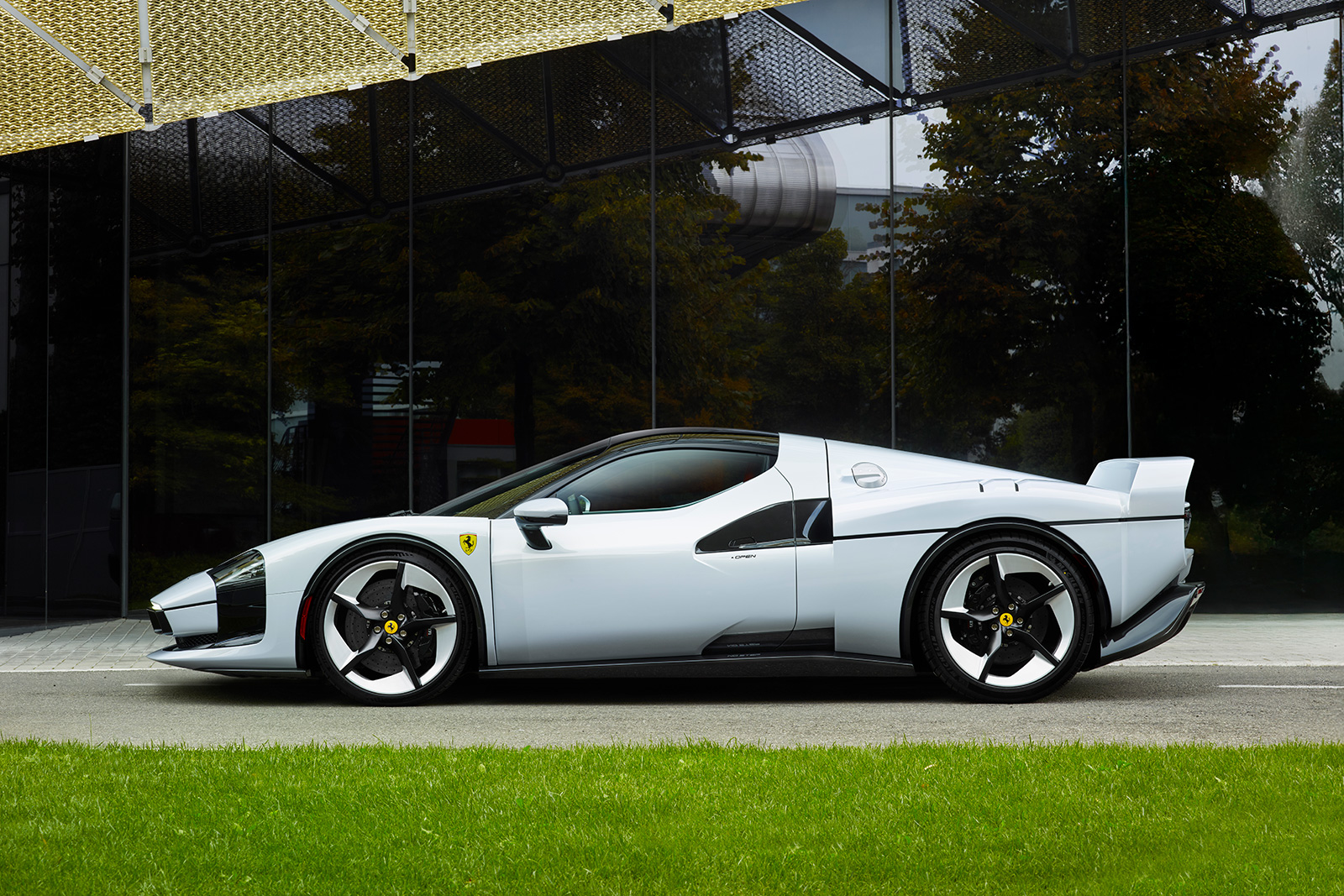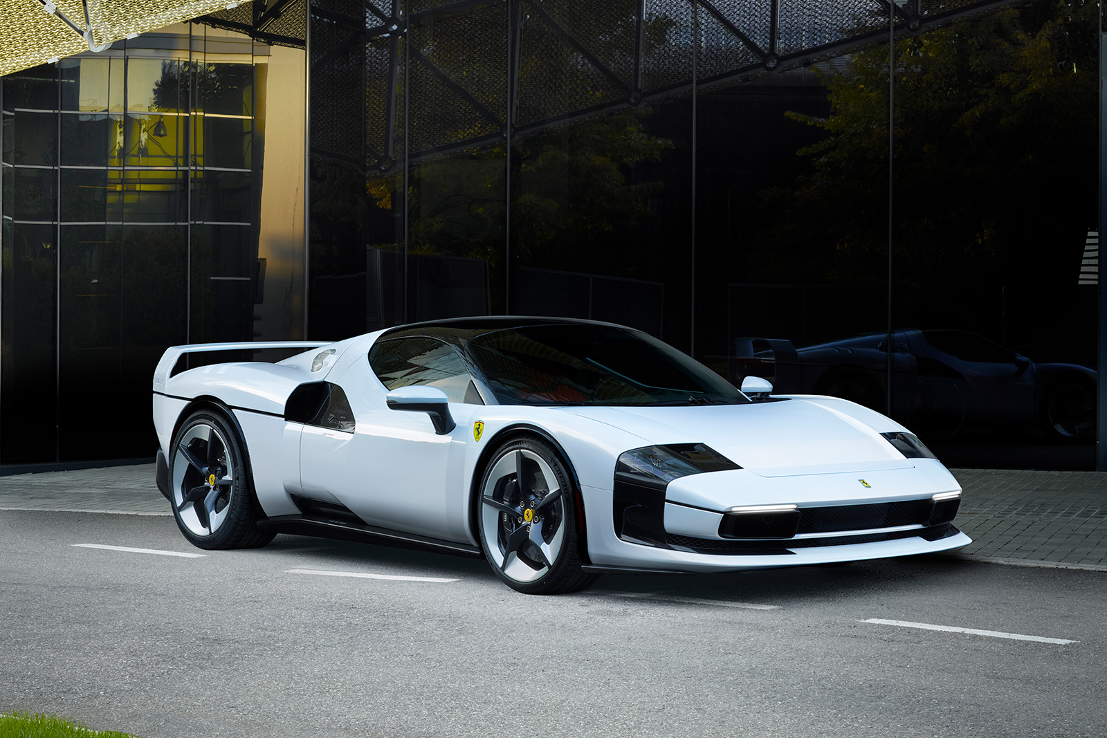 V6エンジンは、スモーク仕上げのLexanルーバーを通して視覚的に強調され、下部のエアインテークと連続性を持たせている。また、リアフェンダーのホイールアーチ付近にも小型ルーバーが配置され、造形上の一貫性を保っている。中央に配置されたアデイティブ・マニュファクチャリング製のエキゾーストには、チタンおよびカーボンファイバー製のテールエンドを採用。ベースとなった296GTBを想起させるテールランプが、彫刻的なリアセクションを完成させている。