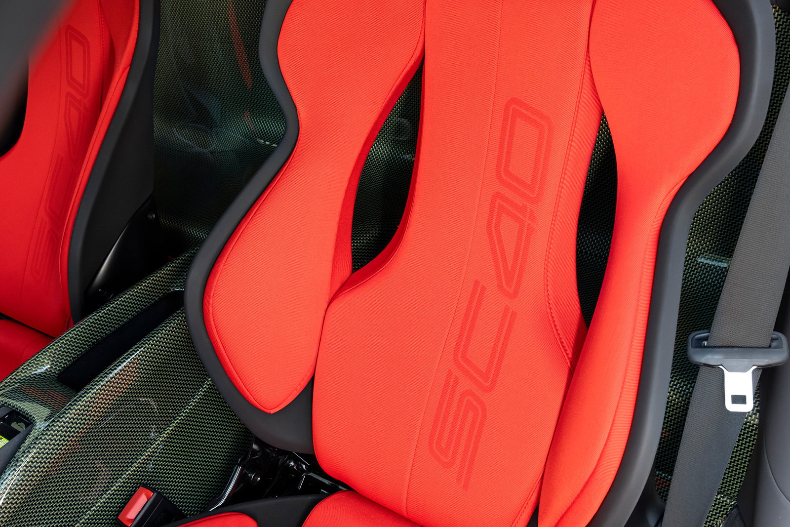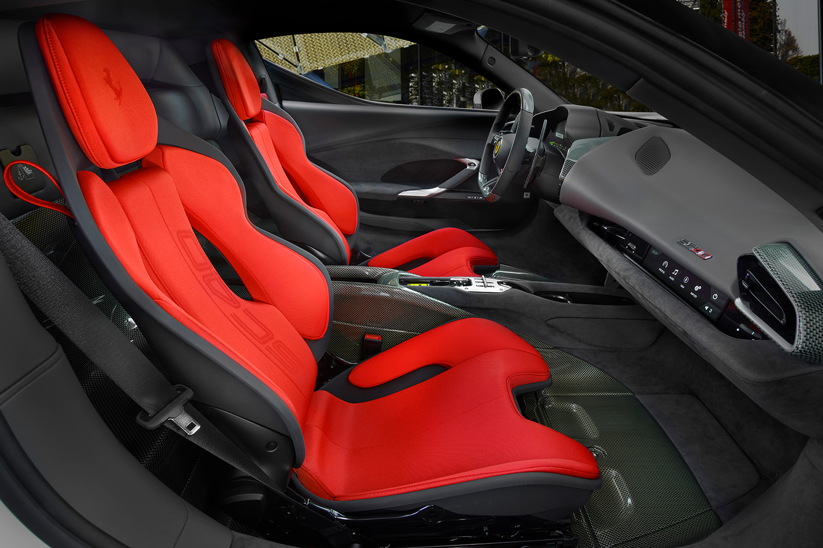 インテリアでは、F40を想起させるケブラー素材の使用に特別なこだわりが見られる。カーボン・ケブラーは同プロジェクトのために再開発され、足元やシート背面、フロアマットの一部に採用されている。さらに、ステアリングホイールやダッシュボードの一部、エンジンベイ、ラゲッジコンパートメントにも同素材を使用。シートはチャコール・アルカンターラと赤のジャカードテクニカルファブリックのコンビネーションで仕上げられ、ヘッドレストの跳ね馬ロゴと織り込まれたSC40ロゴが、現代的でエクスクルーシブな印象を与えている。
