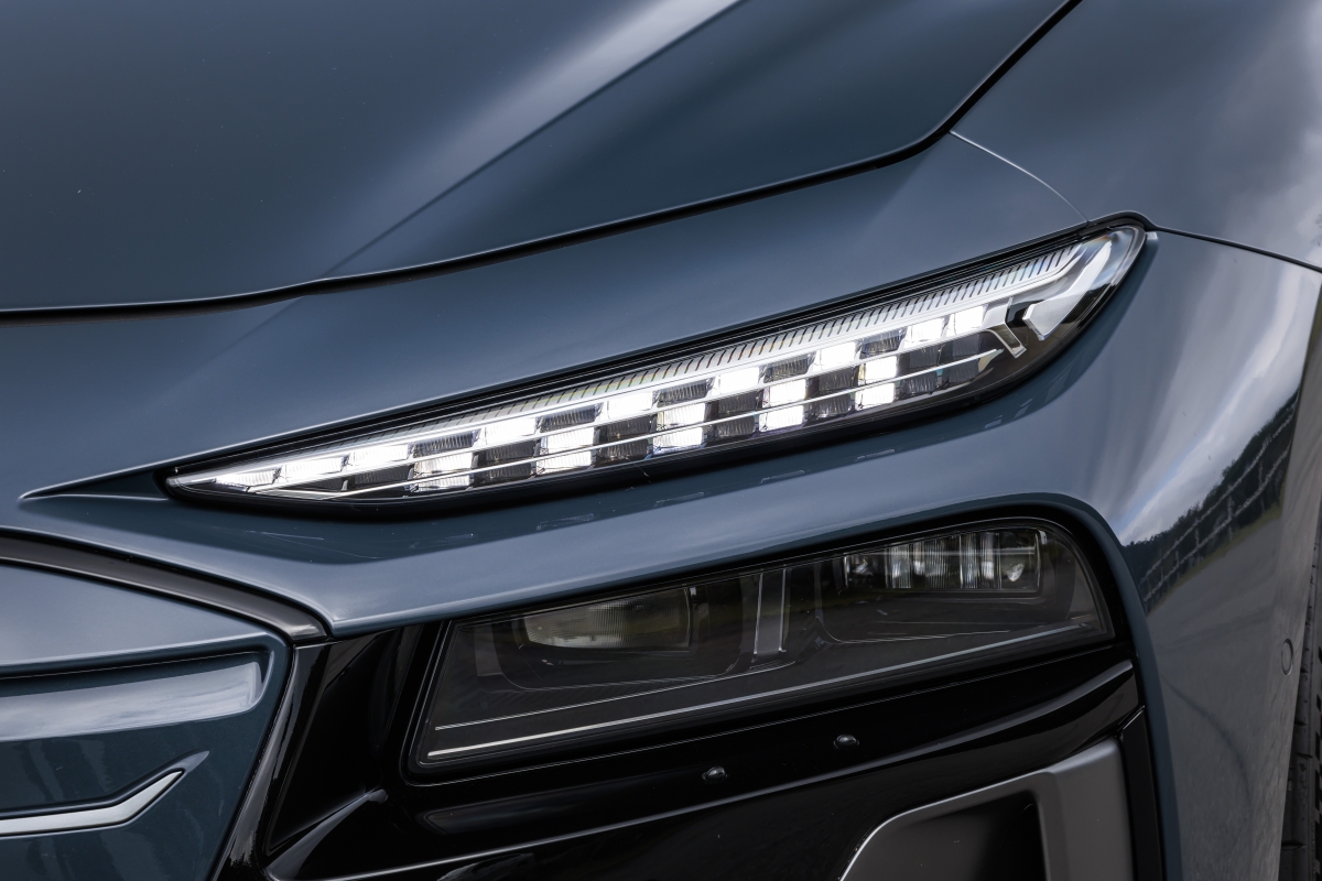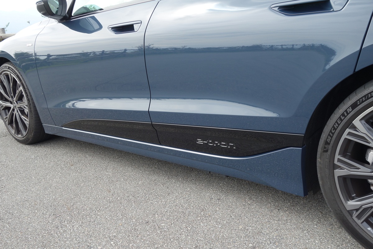1012万円~のプライスタグをつけるA6アバントe-tron performanceの低全高スタイリングはダイナミズム・プログレッシブ、エレガントに焦点を当てた、いかにも空気抵抗が少なさそうな伸びやかさと筋肉質が同居している。バッテリーを床下に敷きつめるPPE=プレミアムプラットフォームエレクトリックの採用で前後ドアの厚みが増しているのだが、ボディサイド下のブラックパネルデザインによって、そうは見せない、クロスオーバーテイストがアクセントになった躍動感あるアピアランスを成立させている。