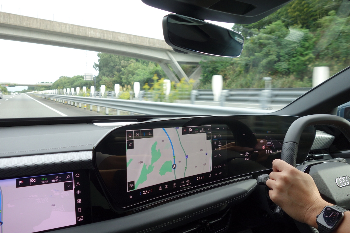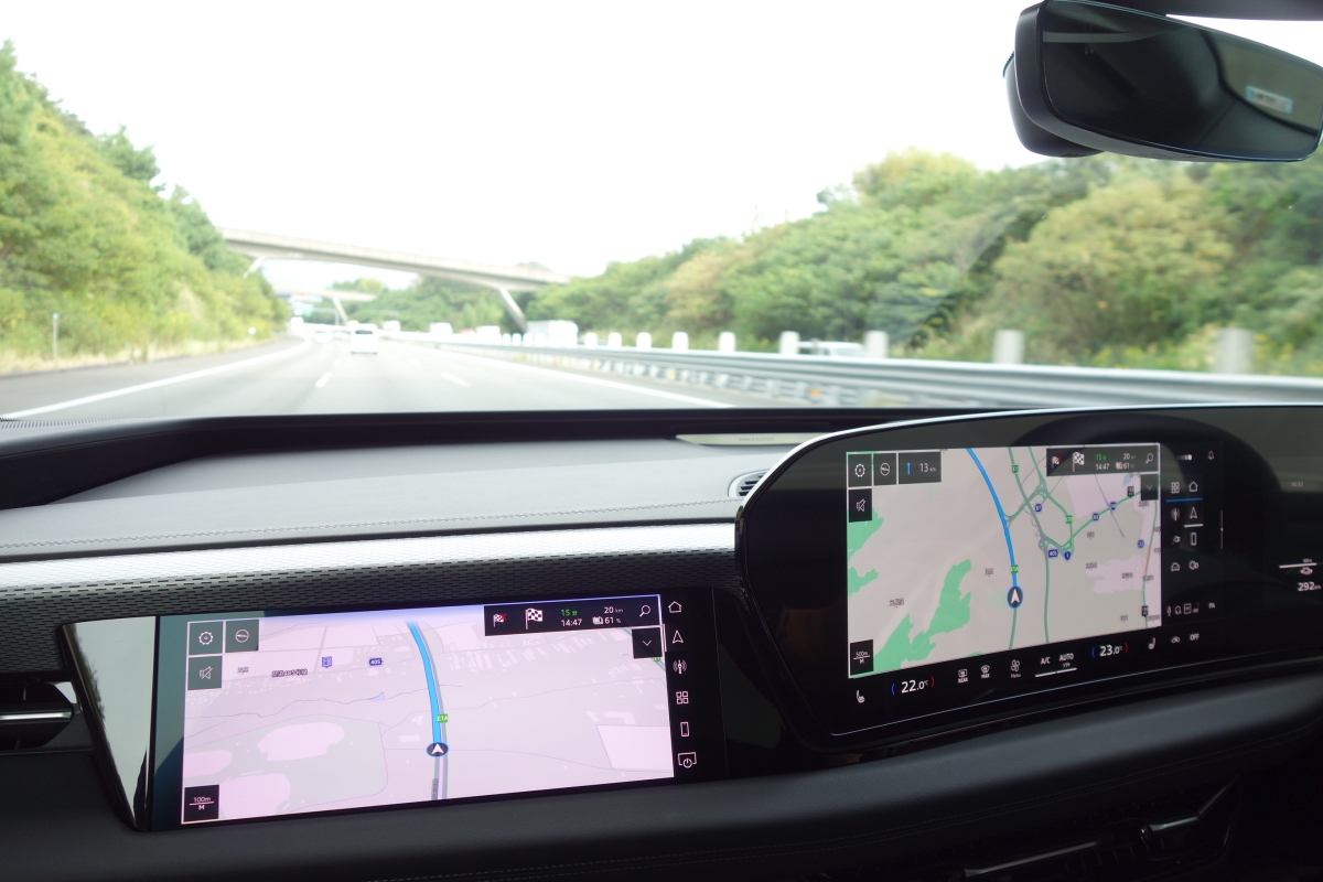 新東名高速道路ではドシリとした直進感の良さもさることながら、悠々とした快適感、安心感に満ちたクルージング性能が素晴らしく、ロングドライブ積極的に行いたくなるほどの頼りがいを感じさせてくれたのだった。ちなみにサイドミラーを完全デジタル化したバーチャルエクステリアミラー(アウトサイドカメラ+室内側ディスプレイ)はこれまで、夜、雨の日の後方確認のしやすさからユーザーの半分が選んでいたというオプション装備だが、この新型A6 e-tronではディスプレイの高さを上げて運転席からより視認しやすくなり、さらにカメラを電動で畳めるようになったという(試乗車は非搭載で未確認)。