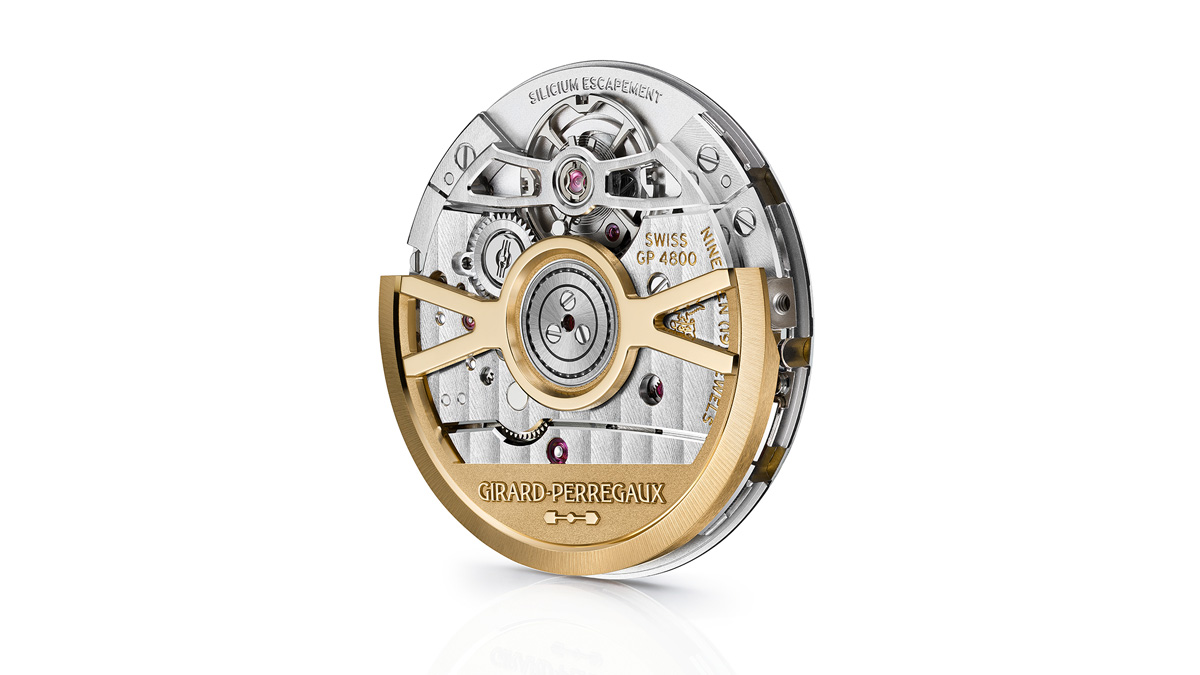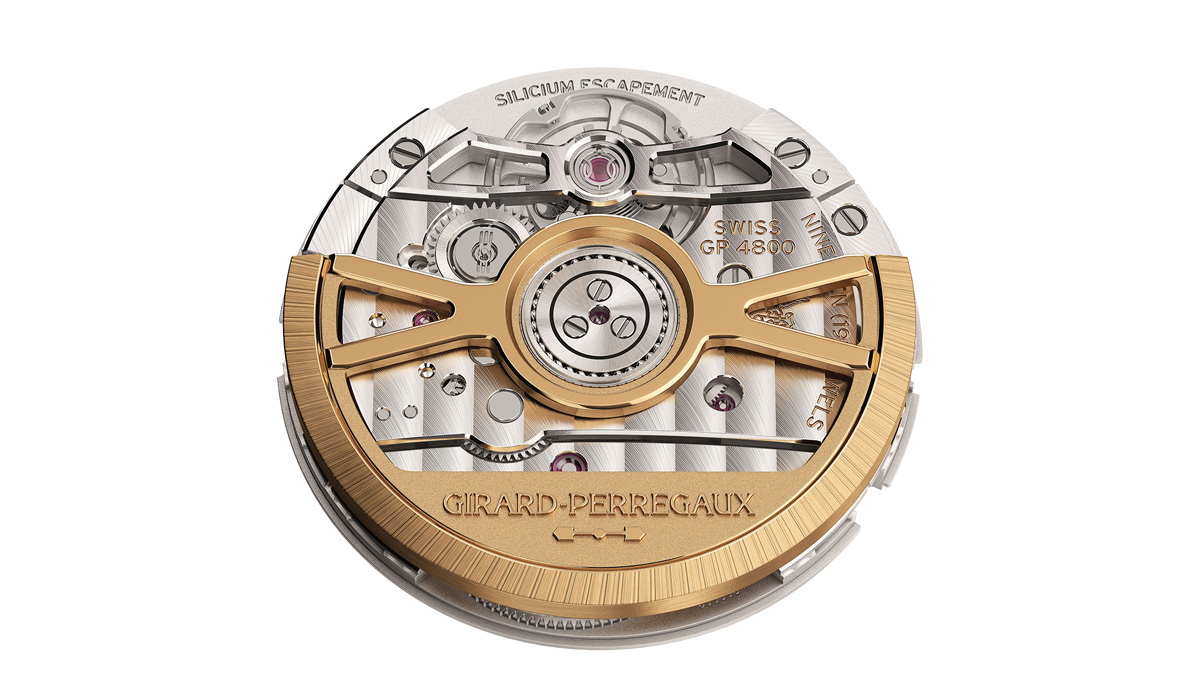 キャリバーGP4800には改良された巻き上げ機構が組み込まれ、ローターはボールベアリングに取り付けられている。ボールベアリングのボールはセラミック製で、巻き上げ時のノイズや衝撃を軽減して長期的な耐久性を確保するショックアブソーバー システムが備わっている。ローターの動きは玉軸受のクラッチシステムに伝達され、主ゼンマイが収まった香箱を一方向に巻き上げる。ムーブメントのデザインは、現代的でありなが、ジラール・ペルゴの豊かな歴史にインスパイアされたさまざまなディテールを取り入れた。スケルトン加工が施された 18K ゴールド製ローターの下には、時計製造におけるブランド最古の象徴のひとつである 1867年に製造された懐中時計から着想を得た3本のブリッジ(受け板)を配している。