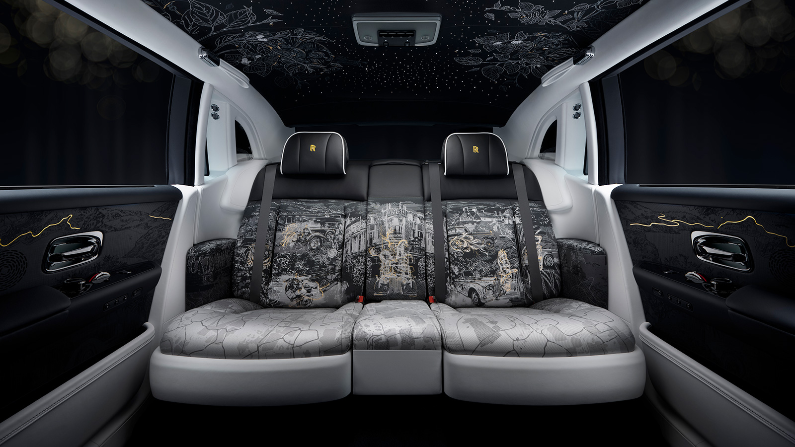 繊細なアニメーションと刺繍によって構成されたスターライト・ヘッドライナーは、44万ものステッチでファントムの歴史に刻まれた瞬間を捉えている。そのデザインには、ヘンリー・ロイス卿がウェスト・ウィッタリングの自邸の庭で、チーフ・エンジン・ドラフツマンのチャールズ・L・ジェナー氏、実験部門を支えたテストドライバーのアーネスト・ハイヴス氏という2人の親しい同僚と共にクワの木の下で撮影された一枚の写真がモチーフとして取り入れられている。この瞬間に着想を得て、ビスポーク・コレクティブは、スターライトの下に座る乗客が、ロイス卿がかつて経験したような創造のひらめきと可能性の瞬間を感じられるような雰囲気をつくり出した。