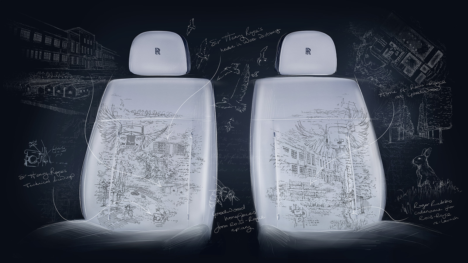 一方フロントシートのレザーには、ビスポーク・デザイナーによる手描きのスケッチをもとに、製図職人の技を想起させるレーザーエッチングが施されている。そのモチーフには、ファントムの100年にわたる比類なき伝統を優雅に物語る象徴的なディテールが含まれており、ロジャー・ラビットを示すウサギのデザイン(2003年のロールス・ロイス再始動時のコードネームに由来)や、1923年のファントムIプロトタイプのコードネームであるカモメなどの要素が配されている。