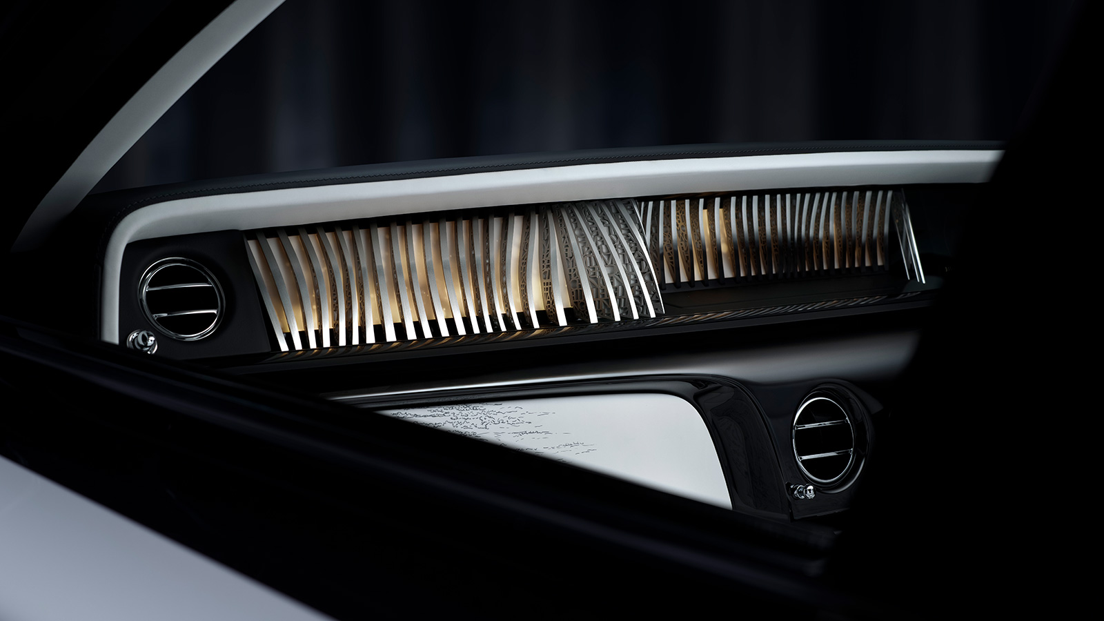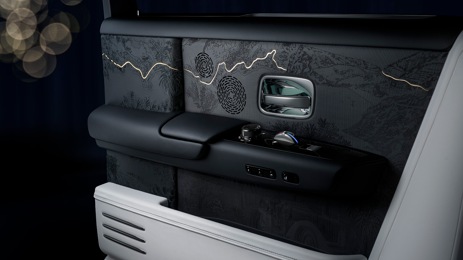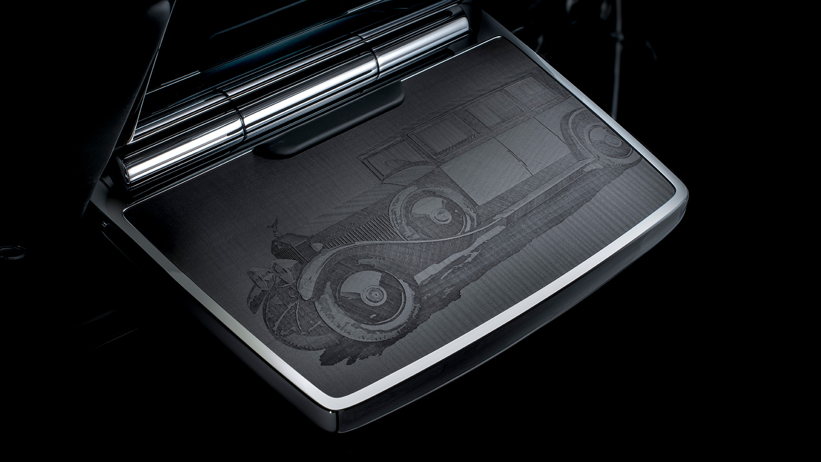 木工細工は、1925年の初代ファントムIと現行のファントムVIIIを、それぞれリアのピクニックテーブルにエッチングで描写している。これらのモチーフは、ピクニックテーブルのレザー張りの背面の刺繍にも左右対称に表現され、過去と現在を結ぶもうひとつのジェスチャーとなっている。そしてピアノブラックのベニヤには、金粉を含有し、24金メッキを施したセンターの回転ダイヤルと呼応する輝きを放つ。