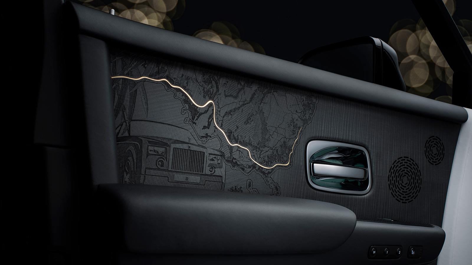 ファントム・センテナリーには、ロールス・ロイス史上最も精緻な木工細工が採用されている。1年以上をかけて開発され、ステイン仕上げのブラックウッドで表現されたドアパネルには、ファントムの個性を形づくった象徴的な旅が描かれている。各構図には、地図や曲線を描く道筋、雄大な風景、花のモチーフ、そして試作車の描写が交差し、ファントムの遺産を生き生きと物語る芸術作品となっている。リアのドアには、ヘンリー・ロイス卿が冬を過ごしたル・レイヨル・カナデル・シュル・メールの海岸線が描かれている。一方、右フロントドアには、現在のホーム・オブ・ロールス・ロイスからわずか8マイルの場所に位置する、ロイス卿が夏の邸宅があったウェスト・ウィッタリングの風景が広がる。左フロントドアは、グッドウッド時代の最初のファントムがオーストラリア大陸を西海岸のパースから横断した4,500マイルに及ぶ壮大な旅路が表現されている。