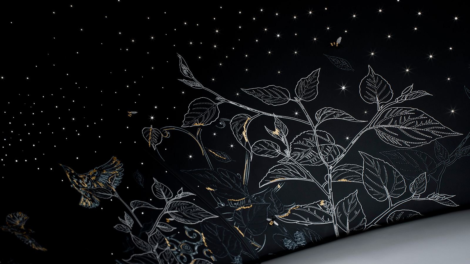 この精緻な生地は、あるファッション・アトリエと共同して12か月をかけて製作された。彼らがオートクチュールの世界以外での仕事を手掛けるのは今回が初めてとなる。ロールス・ロイスが求める耐久性、触感、美観に関する厳格な基準を満たすべく、ファントム・センテナリー専用に設計された特別なインクと技法を用いた高解像度プリント工程が考案され、完成した。高解像度プリント生地は、手描き独特の質感を持つ刺繍で仕上げられている。ビスポーク・コレクティブは、これを「糸でのスケッチ」と呼び、刺繍の工程が布地上に鉛筆の線の表情を再現。各画像を輪郭づけして定義するため、職人はゴールデン・サンズの糸をスケッチ風の不規則なステッチで用い、表面上に細く浮かぶ線の錯覚を生み出す。テクスチャーと奥行きは、シーシェル糸を高密度のステッチで加えられ、全体の構成にわたるこの精緻な技法は16万本を超えるステッチとなっている。