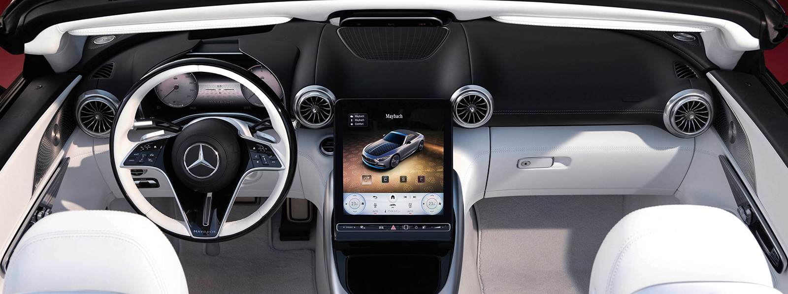 さらにフロントエプロンのワイドなエアインテークと印象的なクロームトリムは、マイバッハSLのスポーティな性格をさらに強調しており、フロントウインドウフレームもクロームで仕上げられている。また、ヘッドライト内部にあしらわれたローズゴールドのアクセントとマイバッハロゴ、ボンネットマスコット、クロームフィン、専用ボンネットが、マイバッハならではの個性的なフロントマスクを形成している。