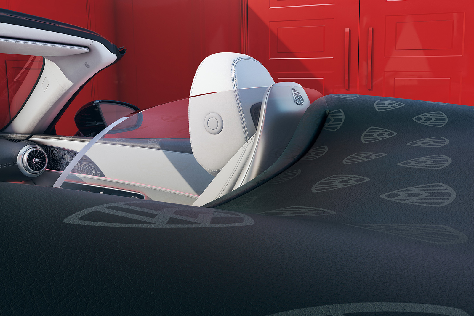 そしてリアエンドは、マイバッハのロゴをあしらったリアコンビネーションランプ、クロームトリム、 ルーバーによって上下に2分割されたエグゾーストエンド、ディフューザーを備えたマイバッハ専用デザインの特徴的なリアエプロンが、エレガントな外観を引き締めている。シート後方には、エアロダイナミクスを追求してデザインされたダブルスクープが配され、オープンモデルならではの個性的なエクステリアを強調している。ボンネットのクロームフィンとサイドスカートのクロームトリムは、2シーターのスタイリングにエレガントなタッチが加えられている。