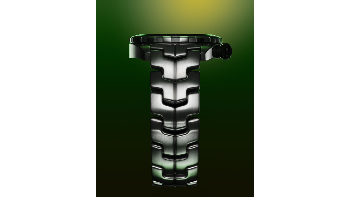 センター秒針にもイエローラッカー仕上げが施され、高精度な動きでパワフルにダイヤル上を進んでいく。F1マシンを彩るカラーリングの幾何学模様に着想を得た新しいインデックスと、スケルトン加工が施されたブラックラッカーの時分針が、視認性とスタイルを向上させている。44 mmケースは、サーキットでのセナの大胆不敵な走りにオマージュを捧げ、ブラックDLCコーティングを施した軽量チタン製。