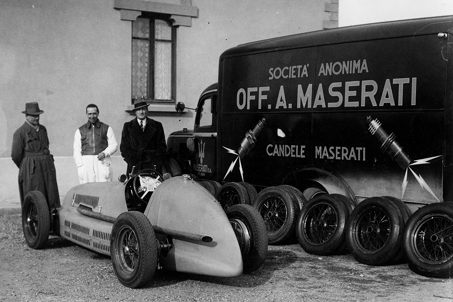 マセラティ兄弟は、機械への深い情熱とスピードへの愛情を胸に、自らレースカーを操ることも楽しんでいた。また、兄弟のひとり、マリオはボローニャの“ネプチューンの噴水”から着想を得てトライデントのエンブレムを描き上げ、ビンドは1932年、アルフィエーリの死を受けて「オフィチーネ・マセラティ」に加わった。前述の通り、トライデントを纏った最初のマシンは「ティーポ26」で、1926年のタルガ・フローリオでデビューを果たし、アルフィエーリが操縦する1.5リッター以下クラスで優勝を飾った。これを皮切りに、インディ500の連覇(1939年・1940年)、タルガ・フローリオ4連覇(1937~1940年)、フォーミュラ1での9勝、そしてフアン・マヌエル・ファンジオとともに1957年のフォーミュラ1世界選手権制覇など、輝かしい記録が続く。
