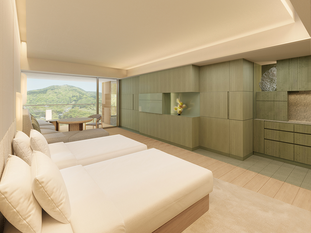 ホテル全体のデザインは、フランス出身デザイナーのグエナエル・ニコラ氏が率いるデザインスタジオ「キュリオシティ」が担当。“Forest Hideaway”をコンセプトに、強羅の豊かな自然環境と調和する、洗練された空間を創出する。温かみのあるグリーンとベージュを基調とした館内には、ロビー、客室、大浴場など、どこにいても視線の先に箱根の山々を感じられるよう、開放的な窓を設けた。自然と静かに向き合う、リゾートならではのひとときを過ごせる。傾斜を生かした立地に西棟と東棟、二つの建物で構成されるホテルは全58室。標準客室面積はバルコニーを含めると約63m²、間口6メートルのゆとりある設計で、バルコニーには、美肌の湯と称される「大涌谷温泉」を源泉とした露天風呂を備えている。