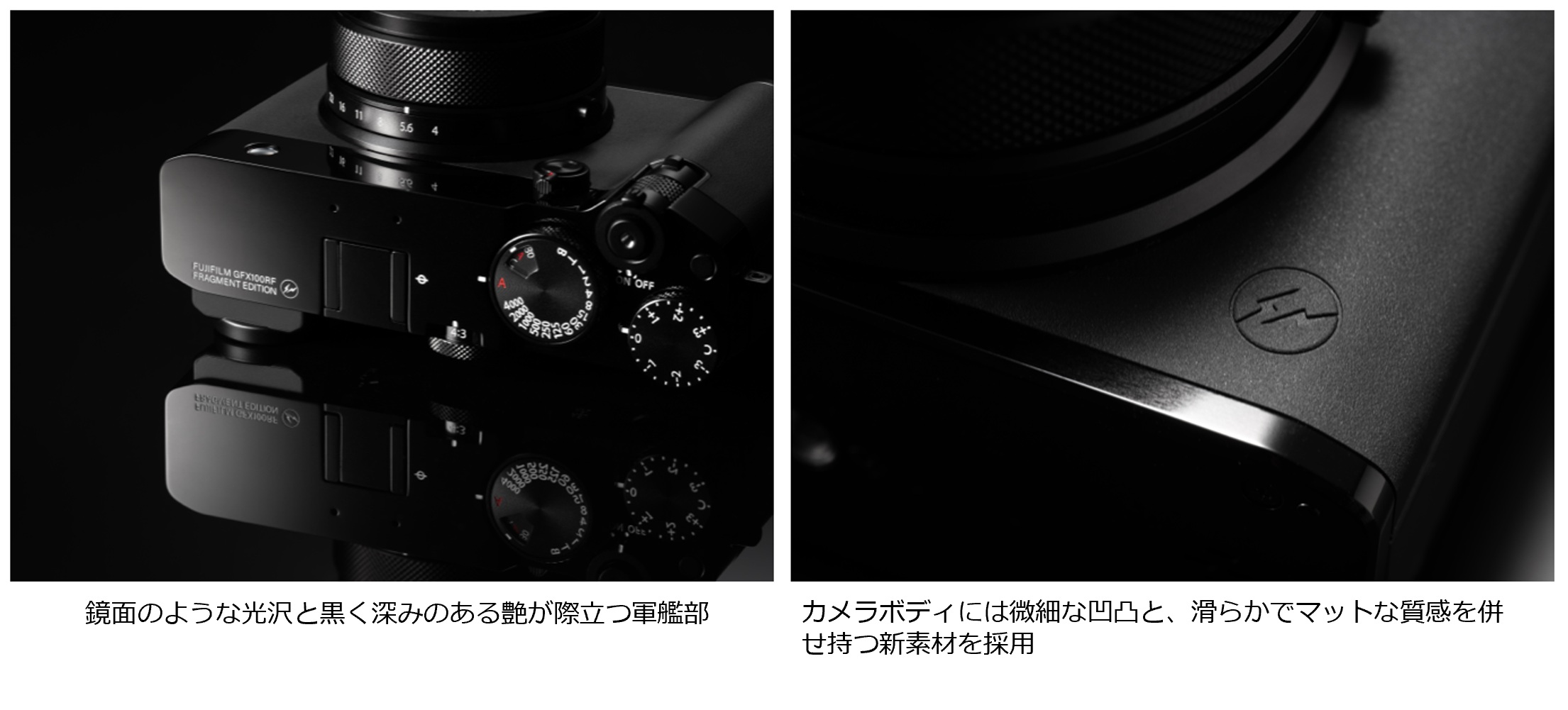具体的には、アルマイト処理に加え、特殊な研磨を徹底的に施し、鏡面のような光沢と黒の深みのある艶が際立つ軍艦部を採用。また、同梱のレンズキャップ・レンズフードなど各種パーツにも同様の仕上げを施し、統一感を高めているほか、カメラのグリップ部には、微細な凹凸と滑らかでマットな質感を併せ持つ新素材を使用し、素材ごとの質感の違いがありつつも、外装デザイン全体に一体感のある高品位な外観を実現。さらに、軍艦部やカメラ前面、レンズフードなどの細部に「fragment design」のロゴを配置し、特別感を高めている。