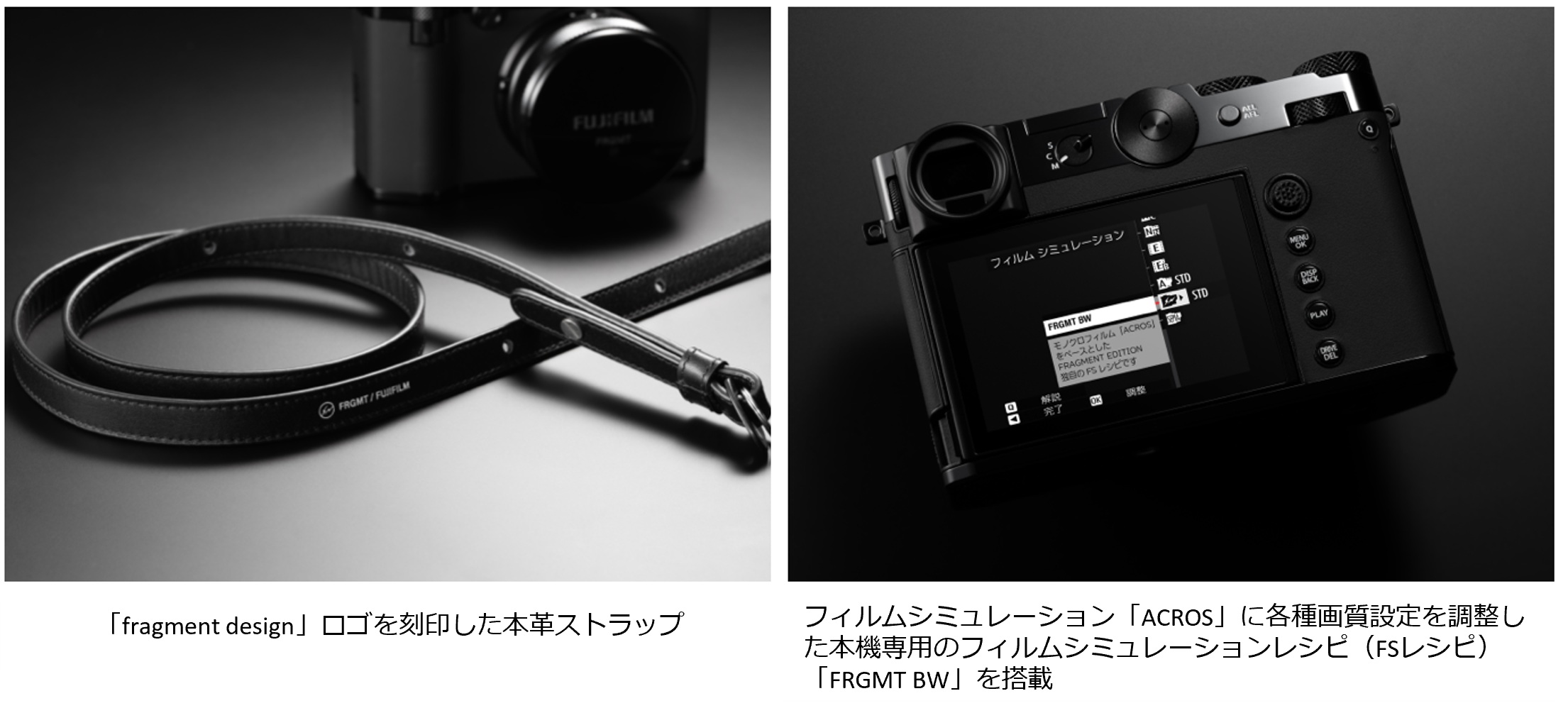 このほか、「GFX100RF FRAGMENT EDITION」限定のフィルムシミュレーションレシピ(FSレシピ)「FRGMT BW」も搭載。「FRGMT BW」はフィルムシミュレーション「ACROS」をベースに画質設定をプリセットしたもので、コントラストが強く、粒状感のある印象的な白黒写真が撮影できる。