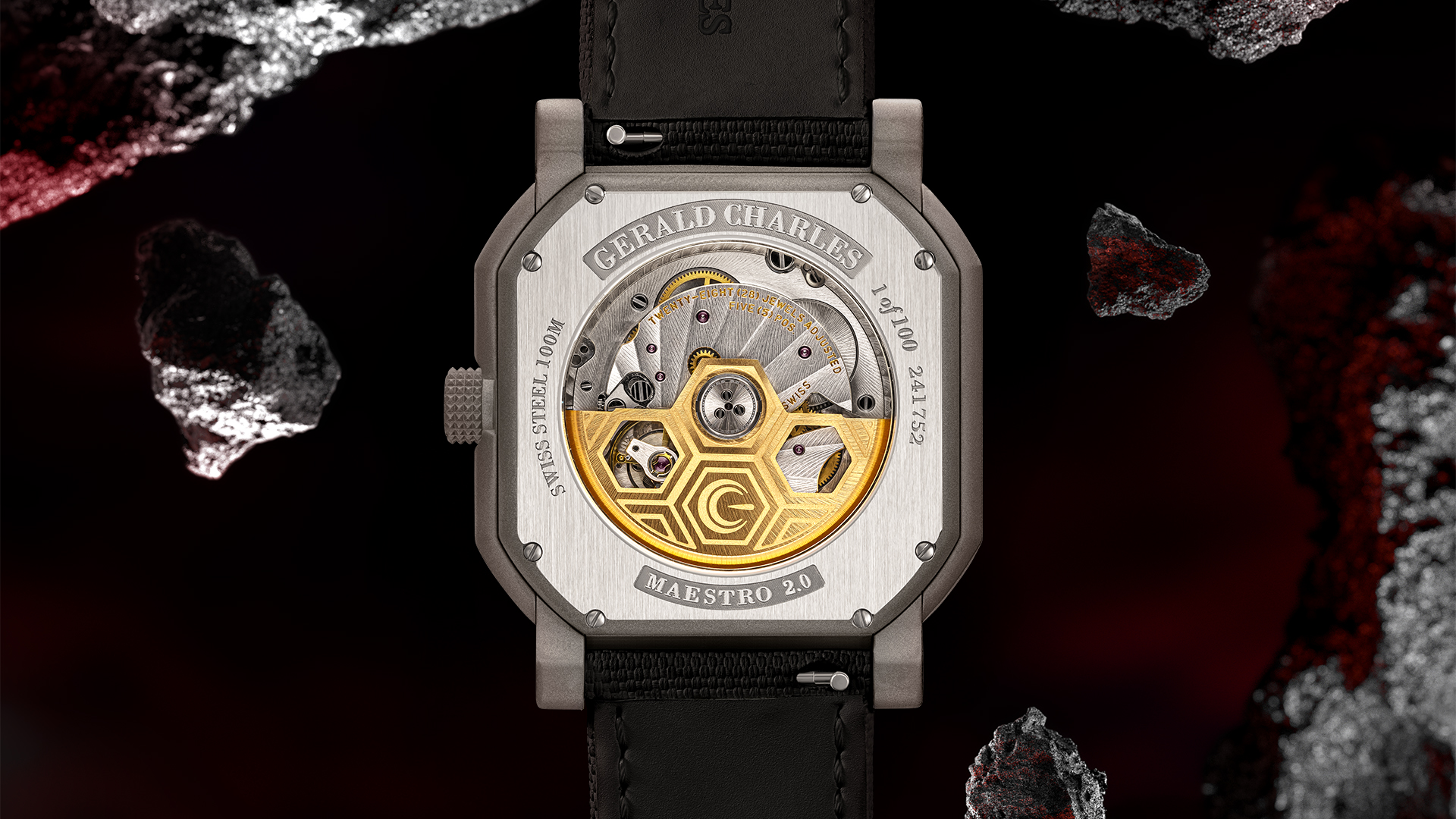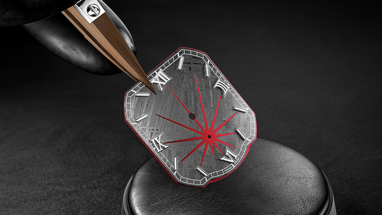 ジェラルド・チャールズのクリエイティブチームが考案したのは、印象的な二層構造。上層には薄くスライスしたメテオライト、その下にはアルミニウム製ベースプレートを配し、ダークブラストモデルには赤、シルバーモデルにはシルバーを採用している。