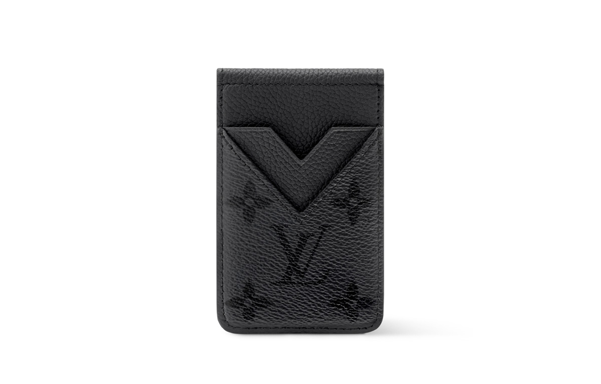単一色のモノグラム·ミッドナイト キャンバスを使用した「コンパクト·マグネット」。革新性とエレガンスを兼ね備えたアイテム。あらゆるiPhoneやMagSafe対応ケースにシームレスに装着できるデザインで、フロントにはカードスロット2つ、開くとさらに3つのスロットが現れる。カードケースとしてはもちろん、安定感のあるスマートフォンスタンドとしても楽しめる多用途な一品だ。