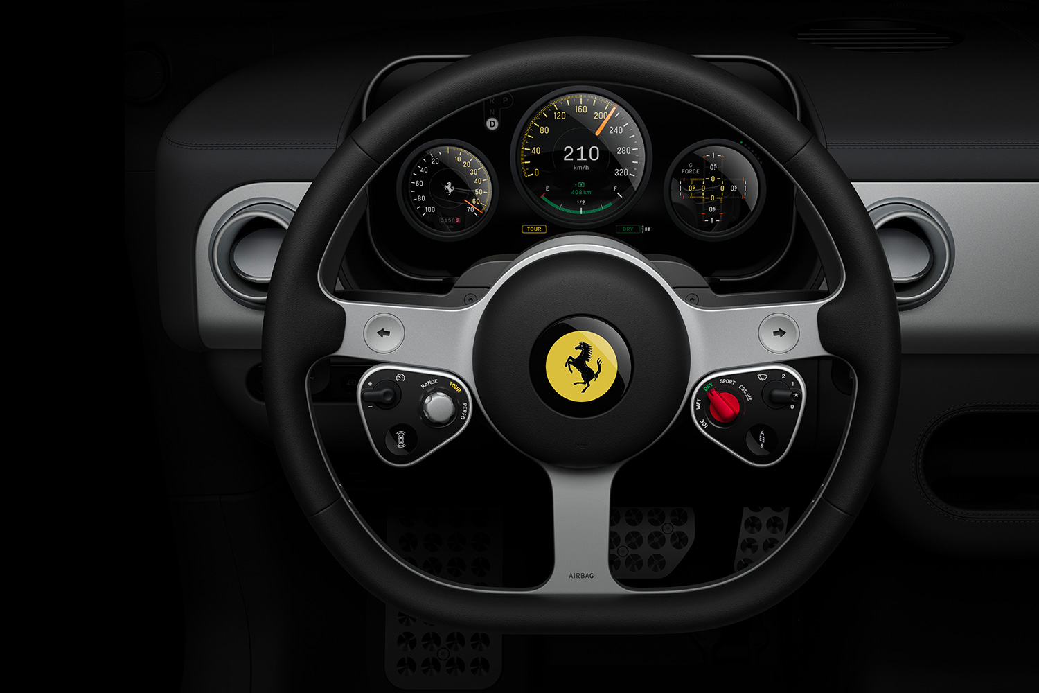 「Luce」のステアリング・ホイールは、フェラーリの豊かなヘリテージにオマージュを捧げつつ、現代的な革新技術も装備している。デザインチームは、シンプルなる本スポークの形状を選んだ。1950~60年代の名高いナルディ製の木製3本スポークを再解釈したものろなる。スポークのアルミニウム構造は意図的に露出させて強調し、素材の強度と仕上げを誇示している。100%再生由来のアルミニウム製で、「Luce」のため特別に開発された合金を使い、機械的な耐久性を確保するとともに、アルマイト処理に適した滑らかな表面を実現した。ステアリング・ホイールは、CNC加工による19個のパーツから成り、標準的なフェラーリのステアリング・ホイールより400g軽くなっている。そしてステアリング・ホイール上のスイッチは、2つのアナログ・コントロール・モジュールに塾理され、機能性とわかりやすさが両立している。この直感的な配置は、F1マシンのレイアウトが踏襲された。各ボタンは、機械的フィードバックと音によるフィードバックが最も調和するよう、フェラーリのテストドライバーによる評価テストを20回以上重ねて開発された。