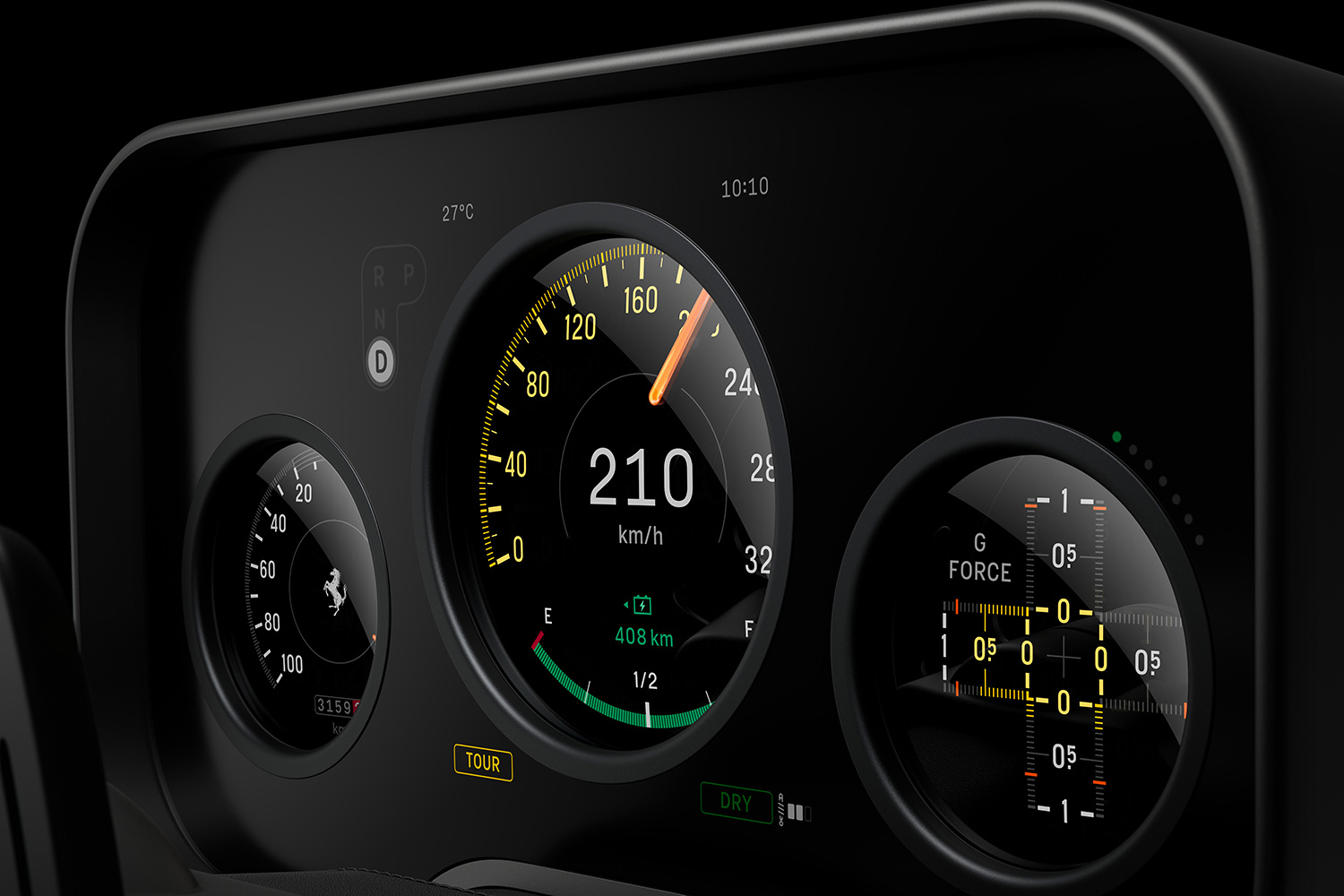 さらにビナクルは、ステアリング・ホイールとともに動いて、ドライバーから計器類が最も見やすい状態を維持し、ドライバー・パフォーマンスを支援する。ステアリング・コラムにインストゥルメント・クラスターが搭載されるのは、フェラーリ車種では初めて。重なり合った2個の有機ELディスプレイを備え、明瞭なグラフィック、鮮明な色、無限のコントラストによって、前例のない視認性を実現している。