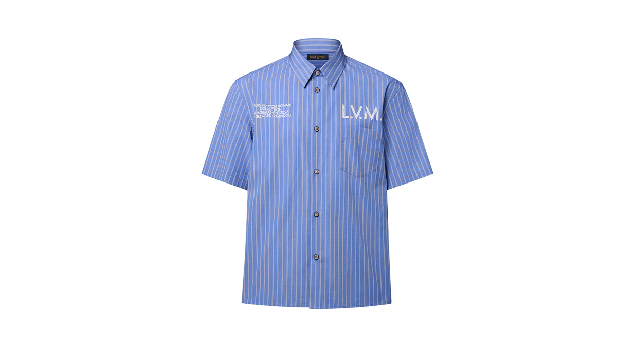 爽やかなブルーのジャカード·ストライプが際立つ、フレッシュなコットンポプリンで仕立てたショートスリーブシャツ。前面に配した「L.V.M.」シグネチャーのプリントがグラフィカルなアクセントを添え、背面のパイピングポケットが実用的なひねりを加えている。さりげない「Louis Vuitton Paris」の刺繍が、背面の裾にスマートなアクセントをプラス。