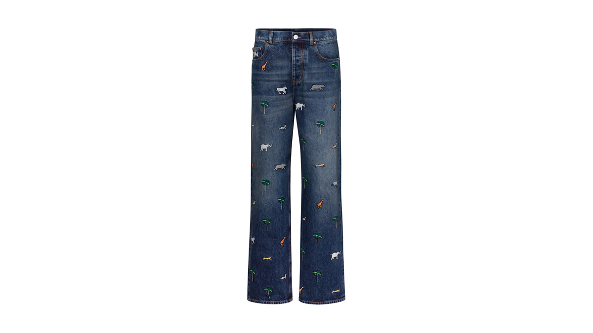 ルイ・ヴィトンが映画『The Darjeeling Limited(ダージリン急行)』のために制作したモチーフが美しい、グラフィカルなデニムスケートパンツ。ヤシの木や動物の鮮やかな刺繍が全面に施された、2026春夏ファッションショーのアイコニックなアイテム。シグネチャーディテールとして、右バックポケットを彩る「L.V.M.」の刺繍とミニ・ダミエ パターン入りのヌバック製ジャクロンパッチを配した。揃いのシャツと合わせればトータルルックが完成する。
