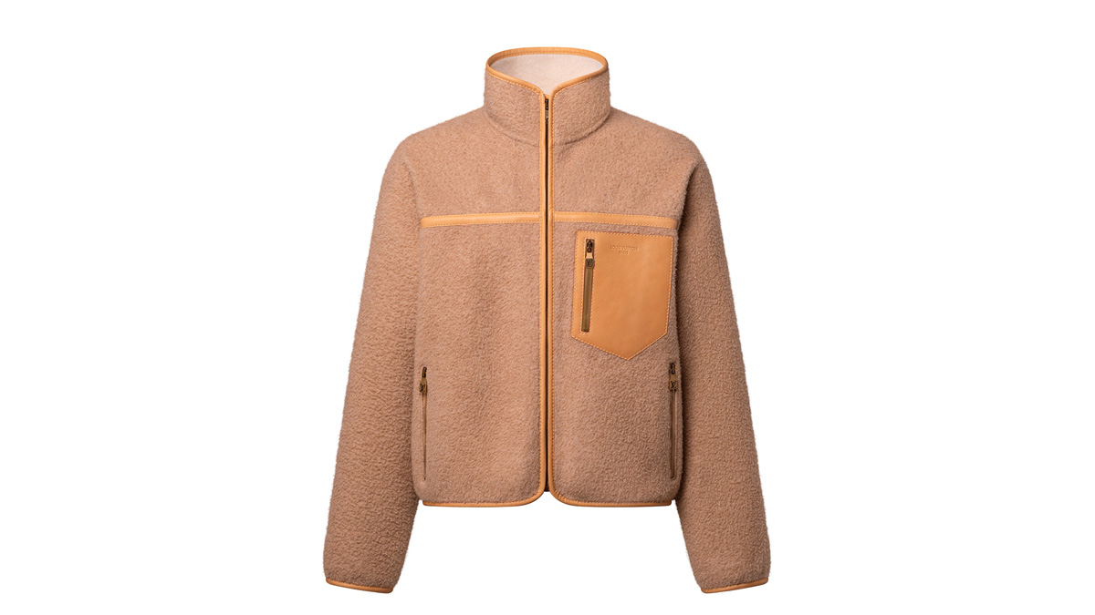 スポーティなシルエットに、洗練されたツイストを加えたアウトドアジャケット。今シーズンのシックな登山のテーマから着想を得たアイテムだ。クラシカルなキャメルカラーのカシミヤ100%のダブルフェイス素材を使用し、エッジやヨーク、胸元にヌメ革のトリミングを施した。ファスナー付きのレザー製の胸ポケットには、「Louis Vuitton Paris」のシグネチャーをさりげなくあしらい、上品な印象をプラス。