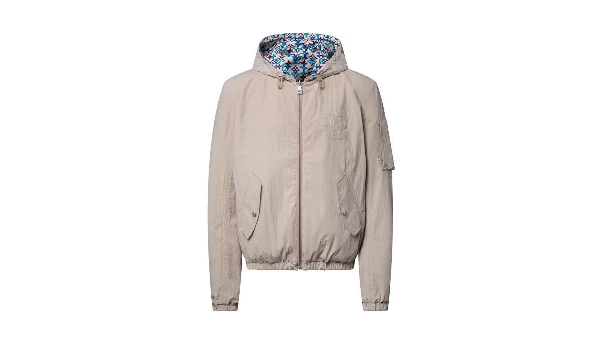 リバーシブルのウィンドブレーカー。外装はミックス&マッチしやすいタイムレスなベージュで仕上げ、胸元には同系色の刺繍シグネチャーあしらった。裏面には、2026春夏ファッションショーを象徴する、インドの職人技の伝統から着想を得たグラフィカルなモノグラム·オーバーラップ モチーフを、鮮やかなターコイズとパープルの色合いで表現。多彩なスタイリングが楽しめる、万能なテクニカルアイテムだ。