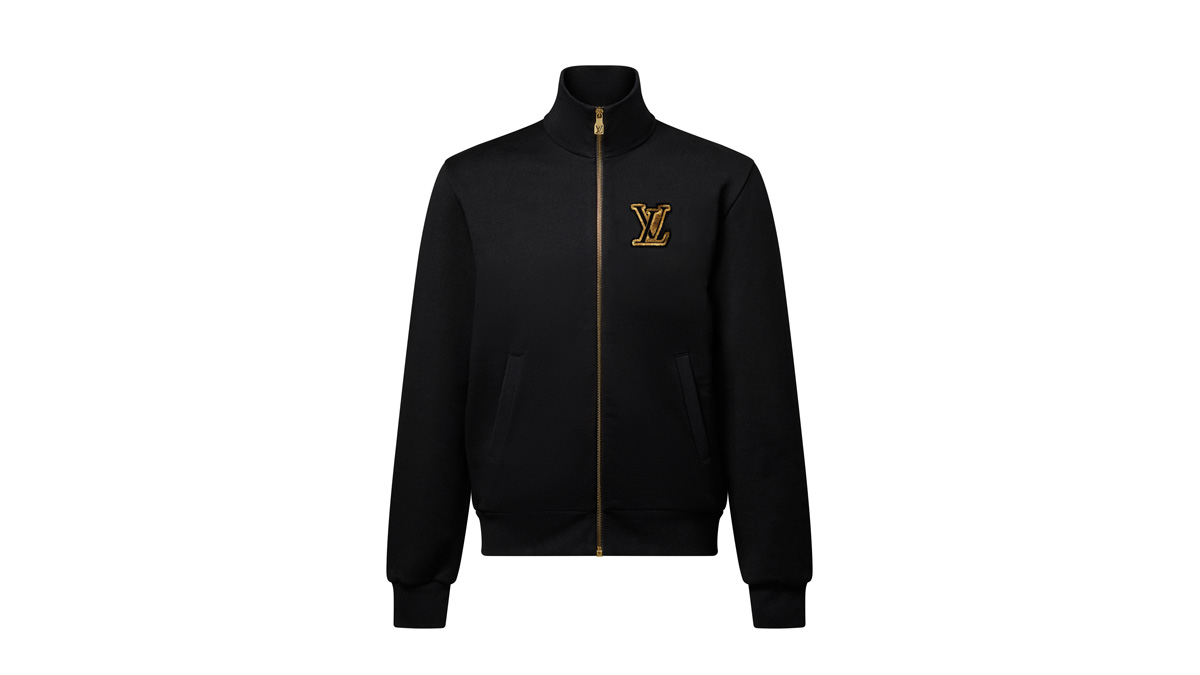 カジュアルな装いにスマートなアクセントを添える、ブラックのファスナー付きトラックトップ。オーガニックコットンを使用し、胸元にはゴールドカラーのスパンコールと刺繍で施された上品なLV パッチを配した。背面にはゴールドカラーのビーズであしらった「Marque L. Vuitton Déposée」パッチをプラス。揃いのTシャツと合わせれば、より洗練されたルックに。