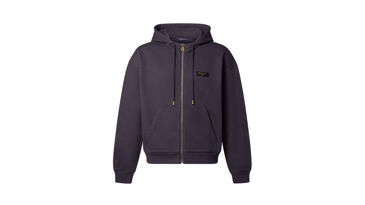 2026春夏ファッションショーならではのパープルインディゴの色合いで、柔らかくヴィンテージ感のある風合いに仕上げたコットンフーディ。左胸元にはブラウンの「Louis Vuitton Paris」レザーパッチがアクセントを添え、フードドローコードのパール風コードエンドがダンディなひねりを加えている。週末のカジュアルな装いに活躍するエフォートレスな1着。