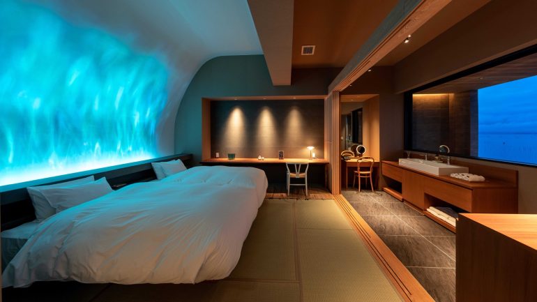 2024年9月、蟹御殿は全16室の客室が改装を終えグランドオープンした。同館は「離れ客室」と「本館客室」に分かれており、旅のスタイルに合わせて好みの客室を選べるように多彩な客室タイプが用意されている。中でも人気は、水を感じさせる光の照明「BeWater lamp」を装備した客室。まるで水の中をただひたすらに流れ、漂うように感じる特別な空間を心ゆくまで楽しめるという。