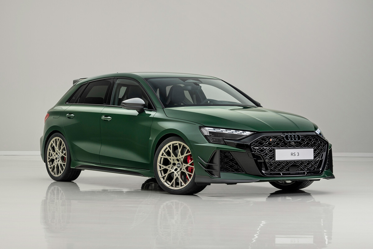 ダークカラーのマトリクスLEDヘッドライトもまた、この特別仕様モデル専用のもの。車両のロック時とアンロック時には、それらのセグメントが1-2-4-5-3のパターンで点灯し、これは5気筒エンジンの点火順序へのオマージュとなっている。なおエクステリアカラーは、3色から選択できる。最も人気のデイトナグレーと新色のグレイシアホワイトマットに加え、エクスクルーシブなマラカイトグリーンは、特に目を引く。このアイコニックなカラーは、5気筒のパワーでラリーの黄金時代を築いたAudi Sport quattroを彷彿とさせる。