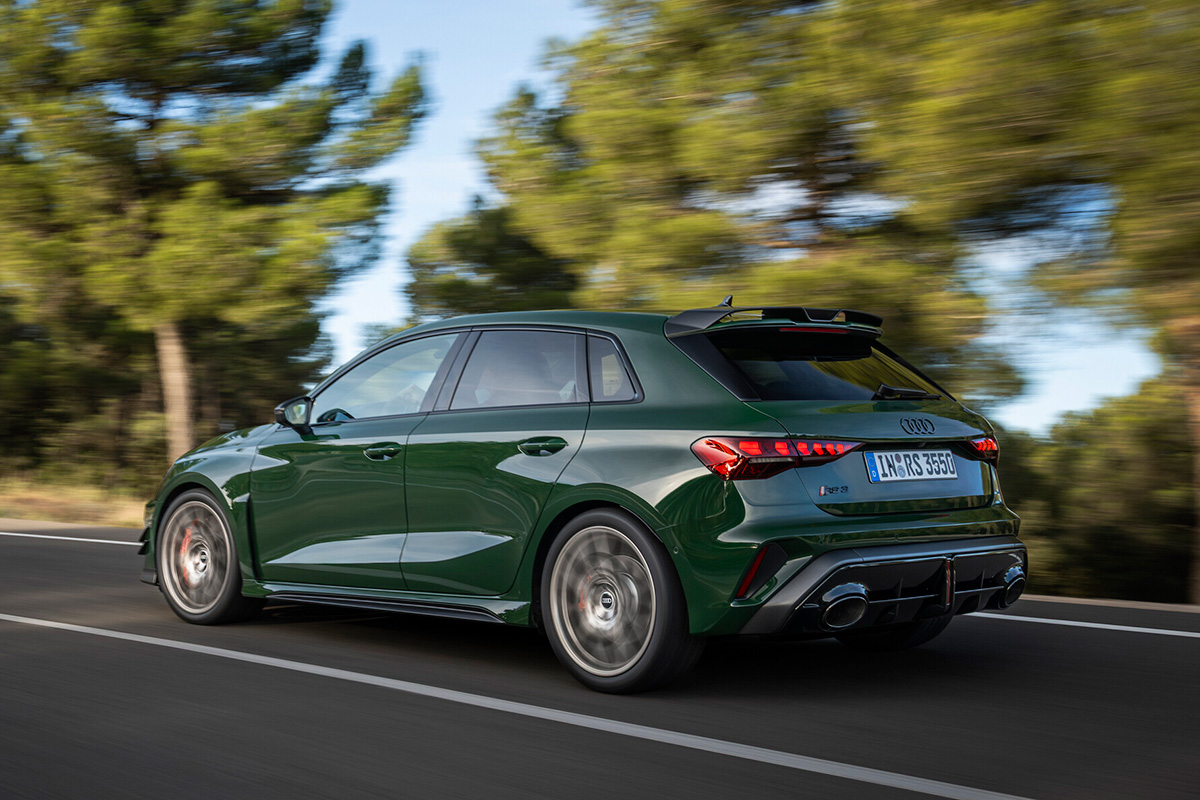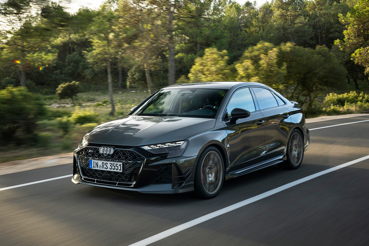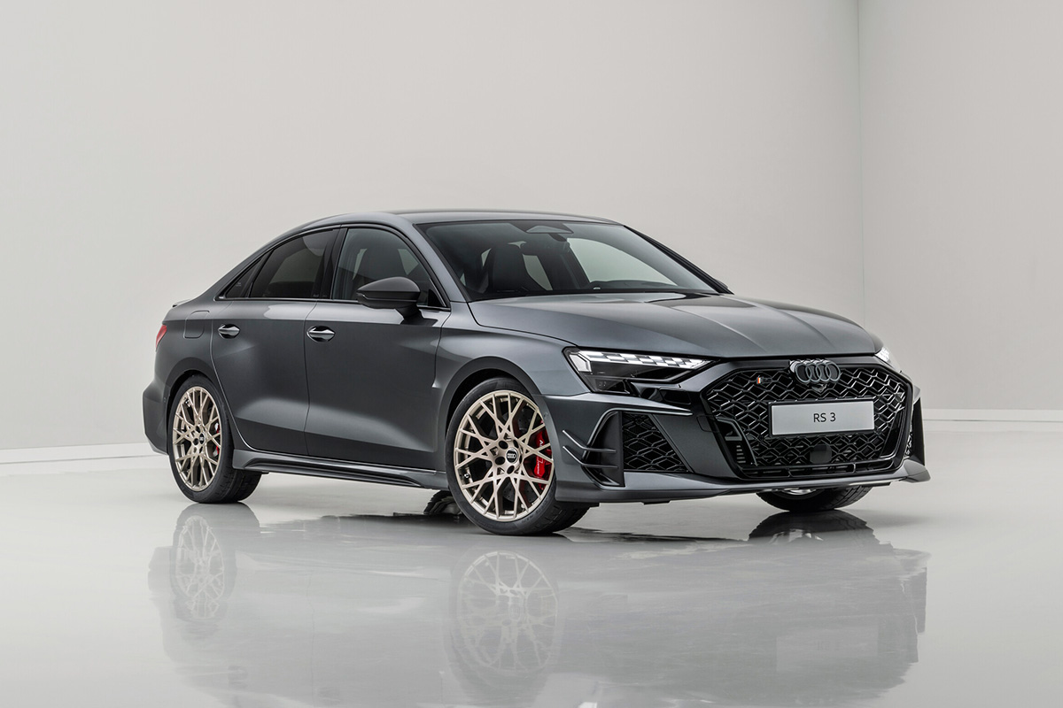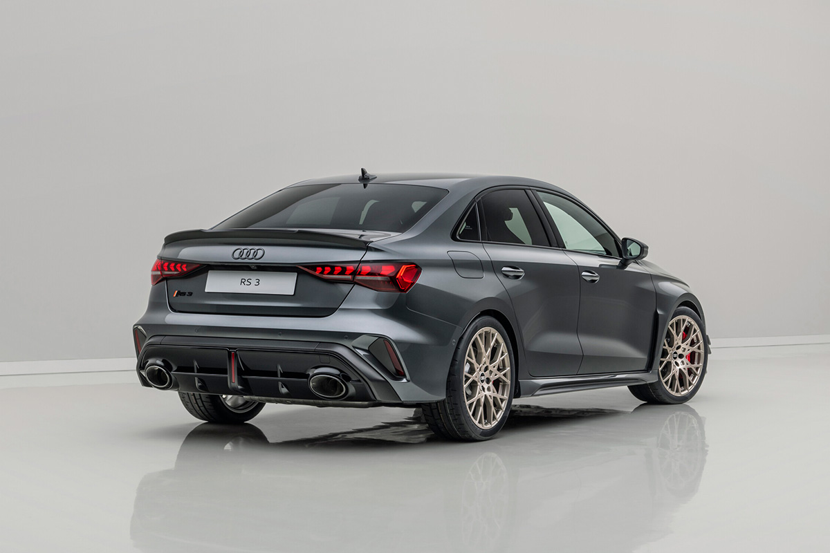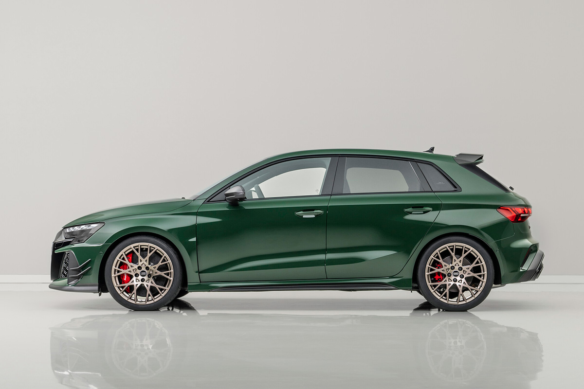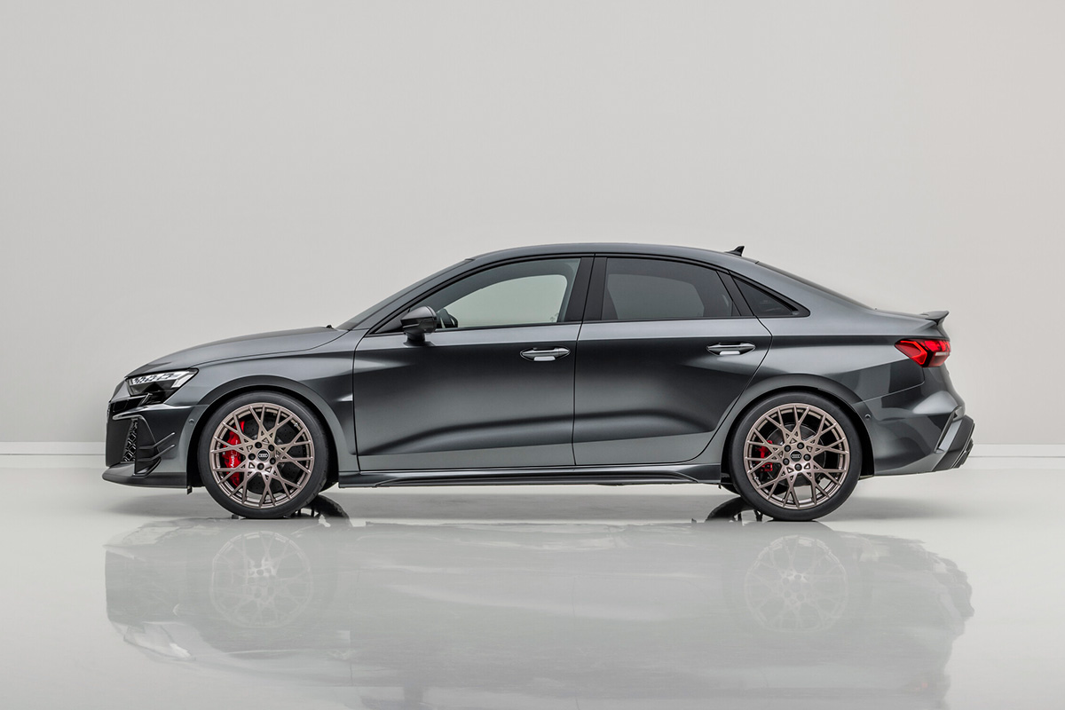 このRS 3 competition limitedは、SportbackとSedanの両モデルが用意されている。両ボディスタイルともに、エクステリアのマットカーボンエレメント、ネオジムゴールドのホイール、そしてRSバケットシート、特別なデジタルダイヤル、シリアルナンバーを備えたエクスクルーシブなインテリアを特徴としている。ボンネットの下にもカーボンが採用し、5気筒エンジンを覆うエンジンカバーはそのテクニカルなルックスで存在感を放つ。ダイナミックなRS 3 competition limitedは、調整可能なコイルオーバーサスペンション、剛性の高いリヤスタビライザー、RSスポーツエキゾーストシステムを備え、最高速度は290km/h、レッドキャリパーがついたセラミックブレーキが特徴。