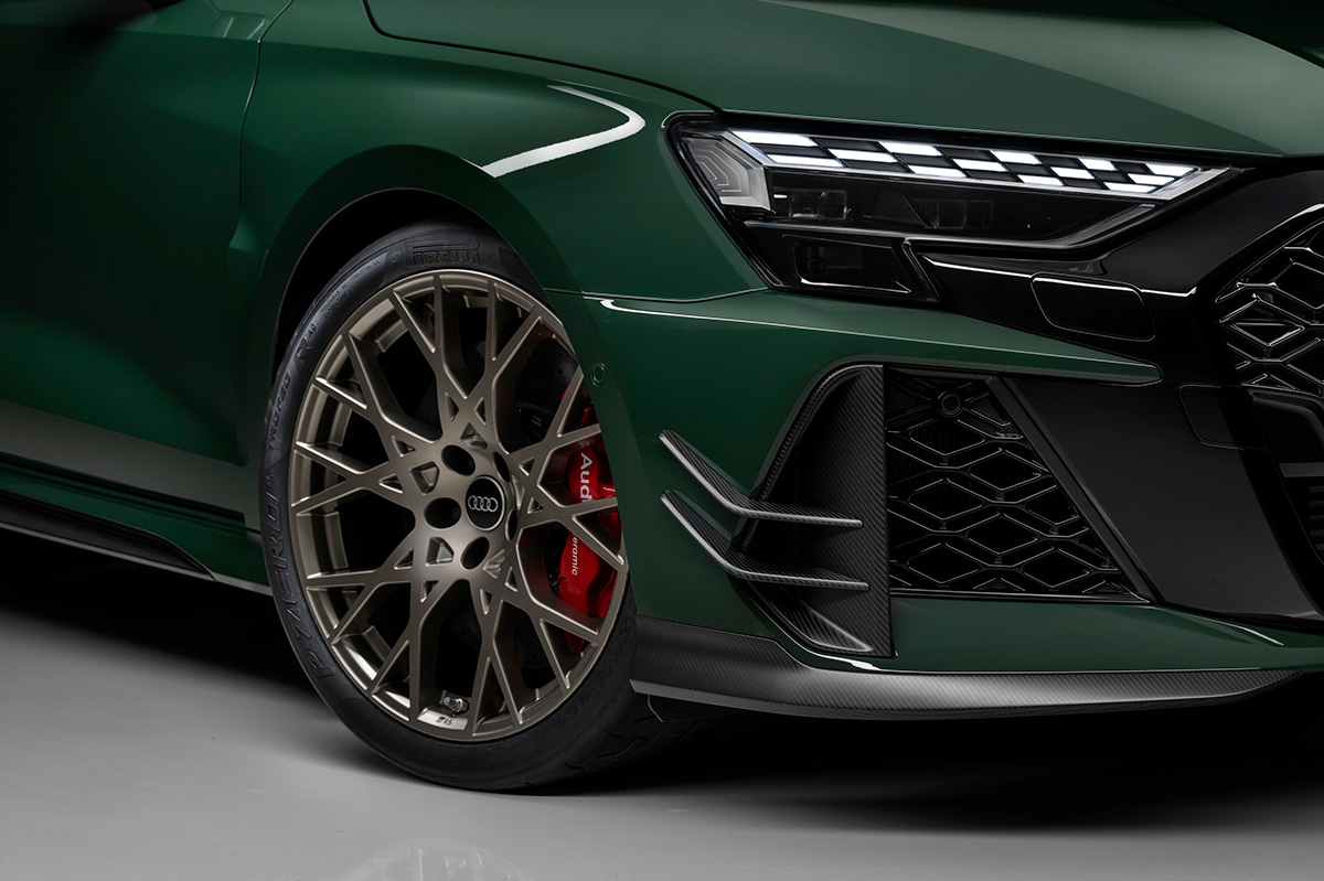 この特別仕様モデルは、表現力豊かなデザインとマットカーボンエレメントを融合させている。これらには、フロントの両コーナーに装着された2つの新しいカナードが含まれる。カナードは、上下に配置され、エアカーテンの垂直ブレードと調和するカーボン製となっている。特別仕様モデルは、インテークの下に装着された分割のフロントリップと相まって、いっそうワイドに見え、RS 3 competition limitedは、あたかも獲物に飛びかかるかのように、低く構えた姿を見せている。