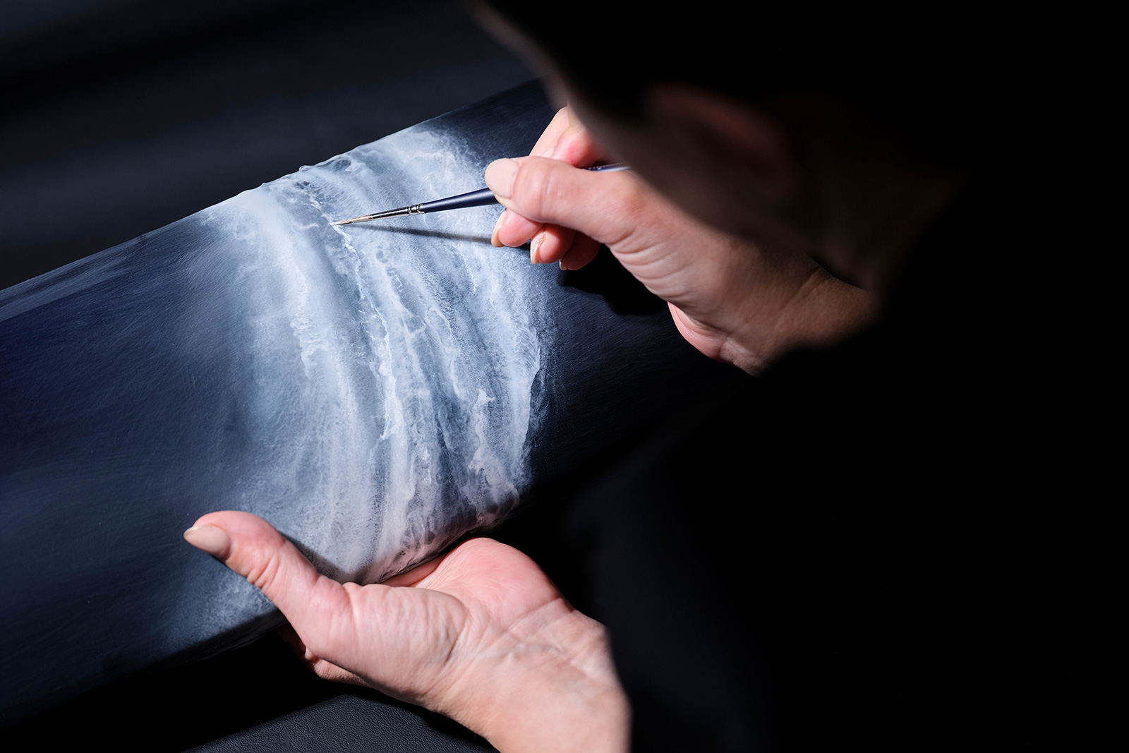 この作品の制作には、塗料の色合いの組み合わせや塗布技術、ラッカー塗装の工程を改良するために2か月におよぶ試行錯誤を要した。波のリアルな表現を実現するため、顔料を湿ったラッカーにエアブラシで吹き付け、その後、細筆を使って手作業で形を整えている。空気を表面に吹き付けつつ、手作業で塗料を動かすことで、自然な動きの感覚を表現している。このペイントによるデザインは、車両の全幅に広がる仕上げの一部として施されている。フェイシアには「Piano Milori Sparkle(ピアノ・ミロリ・スパークル)」と名付けられたビスポークのペイントが使用されており、コート・ダジュールの深く透き通るような青色を彷彿とさせる、深みのあるメタリックブルーに仕上げられている。