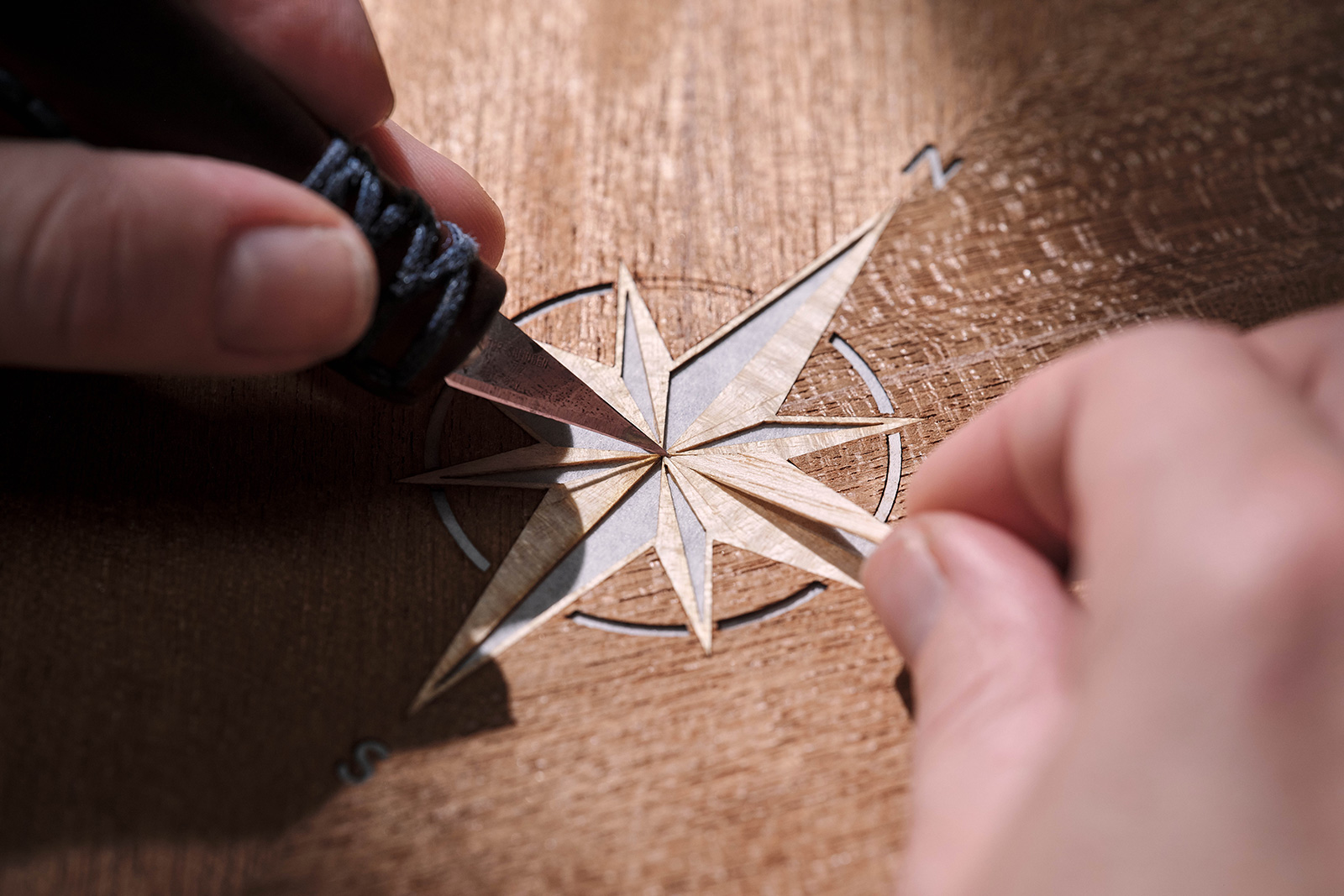 そしてリアのウォーター・フォールには、テーマを象徴するコンパス・モチーフがマルケトリーであしらわれている。このデザインは、シカモア、チーク、アッシュ、ブラック・ボリバルのベニヤ材40枚以上から構成されるもので、精密にカットし、手作業で組み立てられたもの。