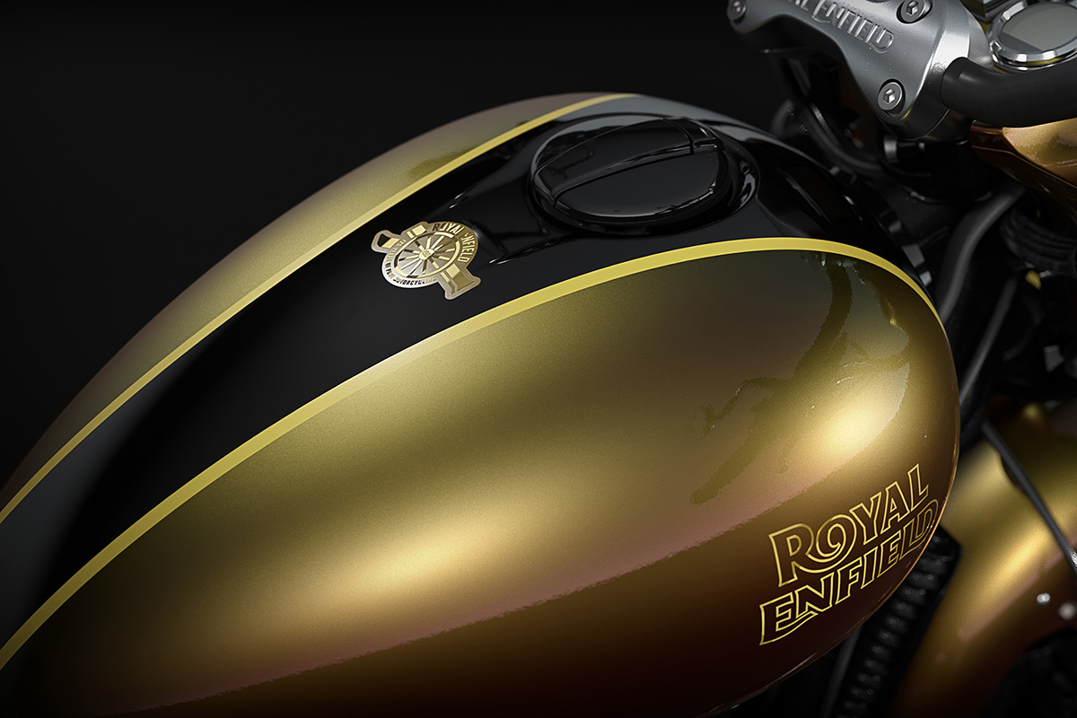 1901年に誕⽣した最初のロイヤルエンフィールドから続く125年の系譜を祝し、ブランドの象徴ともいえるCLASSICシリーズの特別モデルとなる。ティアドロップタンクとヘッドライトナセルという、約1世紀にわたってロイヤルエンフィールドのモーターサイクルのデザインを定義してきたディーテールとフォルムを受け継ぎながら、ブランドとCLASSICシリーズ双⽅のヘリテイジに敬意を表したデザインを採⽤した。