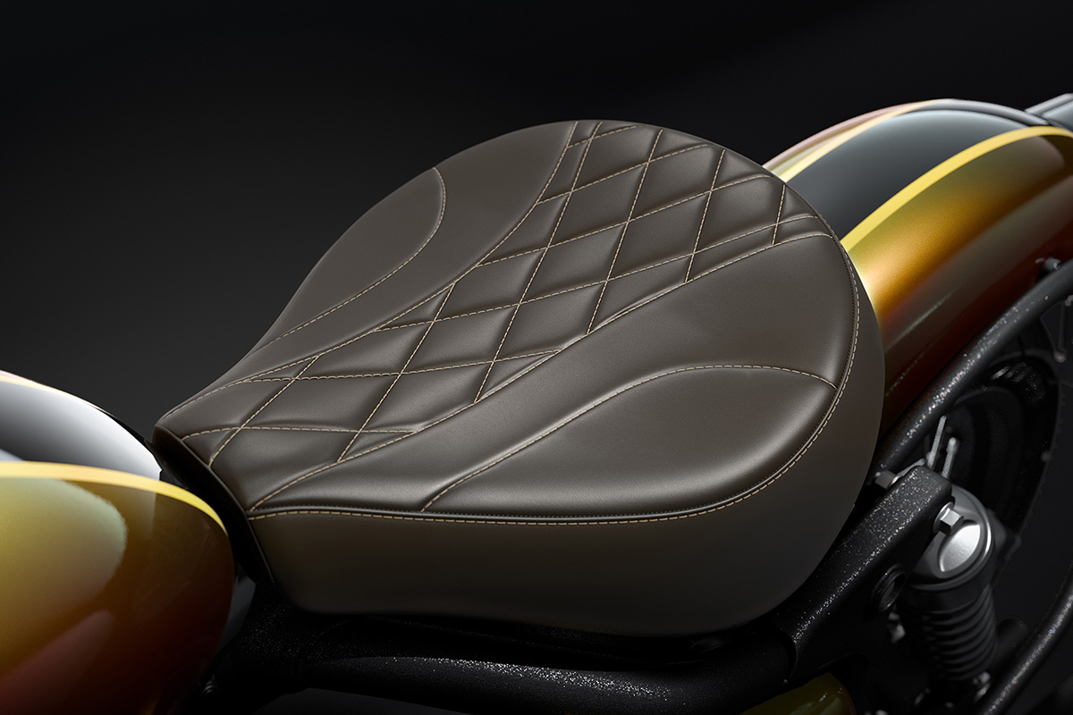 燃料タンクには、⾦のエンブレム「125 YEARS」があしらわれ、クラシックレッドの上にハイパーシフト塗装が施されている。この塗装は、光の⾓度によって⾚から⾦、明から暗へとその表情が流れるように変化し、⾓度によって印象が変わるようダイナミックに仕上げられている。この万華鏡のような独特な塗装は、ロイヤルエンフィールドが持つ「伝統と進化の融合」の象徴として開発された。