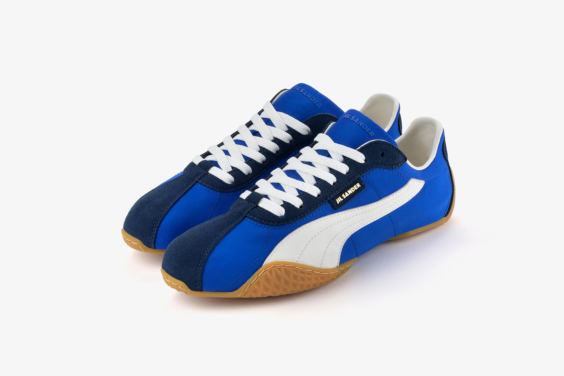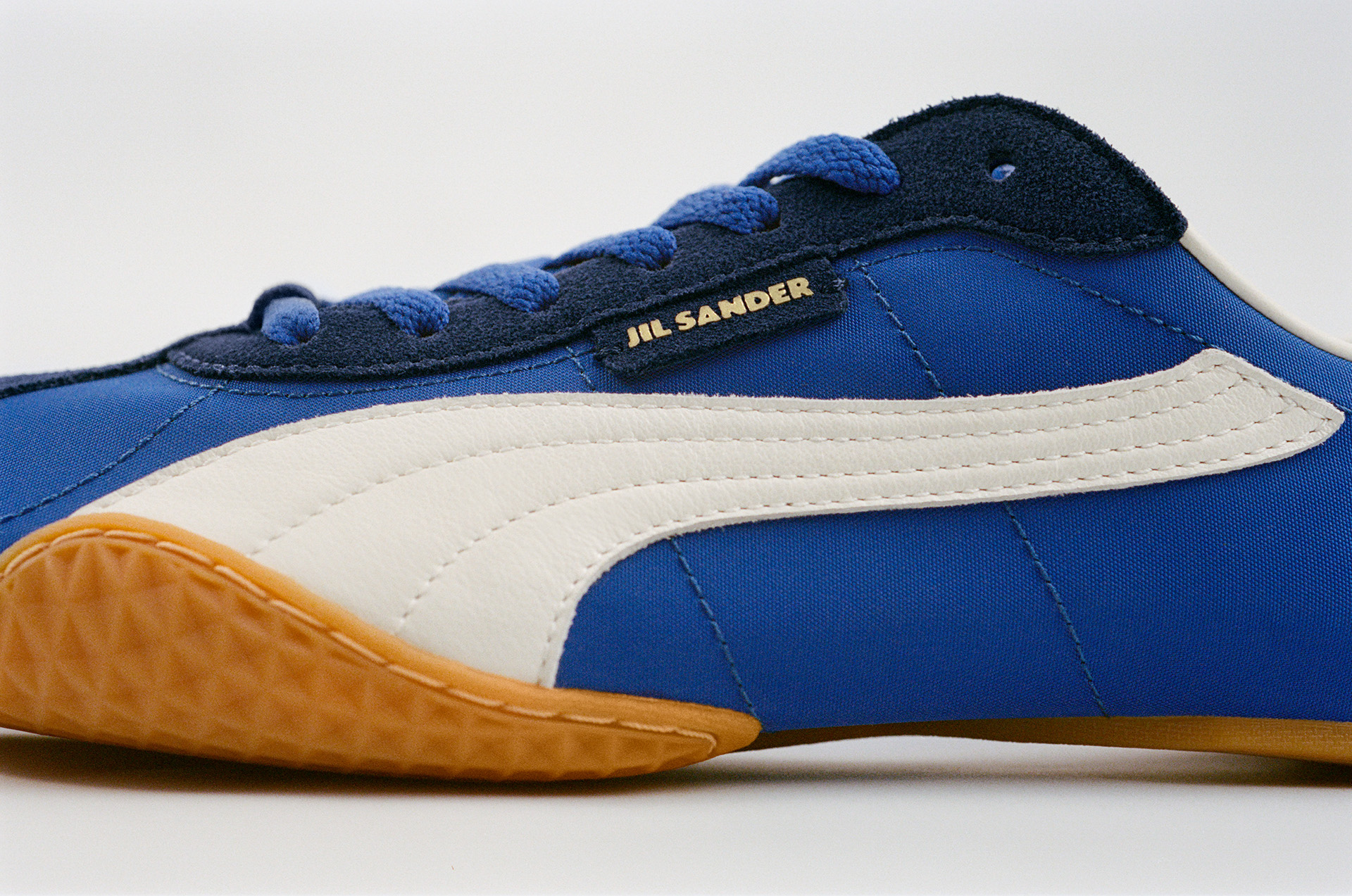さらに本モデルは、プーマのアーカイブランニングスパイク「H-STREET(H-ストリート)」から着想を得たアッパーと、空手からインスピレーションを受けたソールを融合。スポーツとファッションの要素を横断するデザインとなっている。素材は2種類、カラーは3色で展開。落ち着いたブロンズトーンのパンチングスエード、ベージュのキャンバス、コントラストの効いたスエードディテールを配したエレクトリックブルーのナイロンの3種類を展開。JIL SANDERのブランディングに加え、ヒールにはプーマのキャットロゴを配している。
