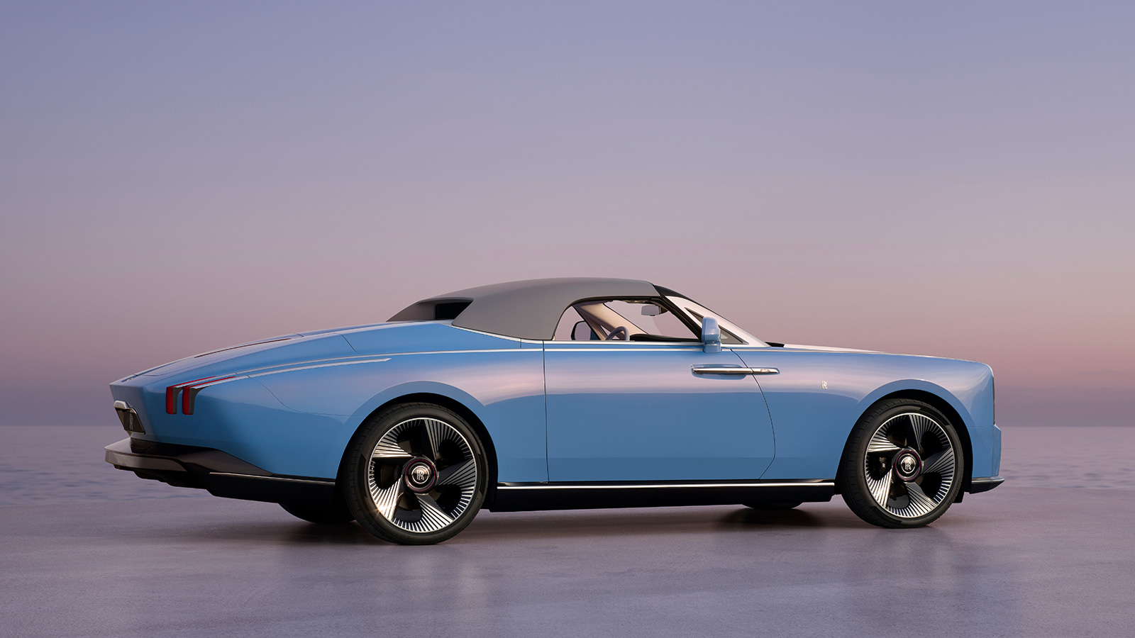 側面から見ると、プロジェクト・ナイチンゲールのドライバーを中心に据えたトーピード形状のデザインが鮮明に際立つ。伸びやかなボンネットは、鋭く傾斜したフロントガラスへとつながり、その両側には ファントム・ドロップヘッド・クーペに着想を得た、ステンレススチールのフレームに囲まれた繊細なクォーターライト・ウィンドウが配置されている。さらにその後方には、ボディの奥深くに配置された2名乗りのコンパクトなキャビンがあり、リアデッキは低く傾斜して細く絞り込まれている。ボンネットとテールによるこの大胆な構成により、2シーターのキャビンは、ボディの堂々としたボリューム感と対照的な、親密で特別な空間となっている。
