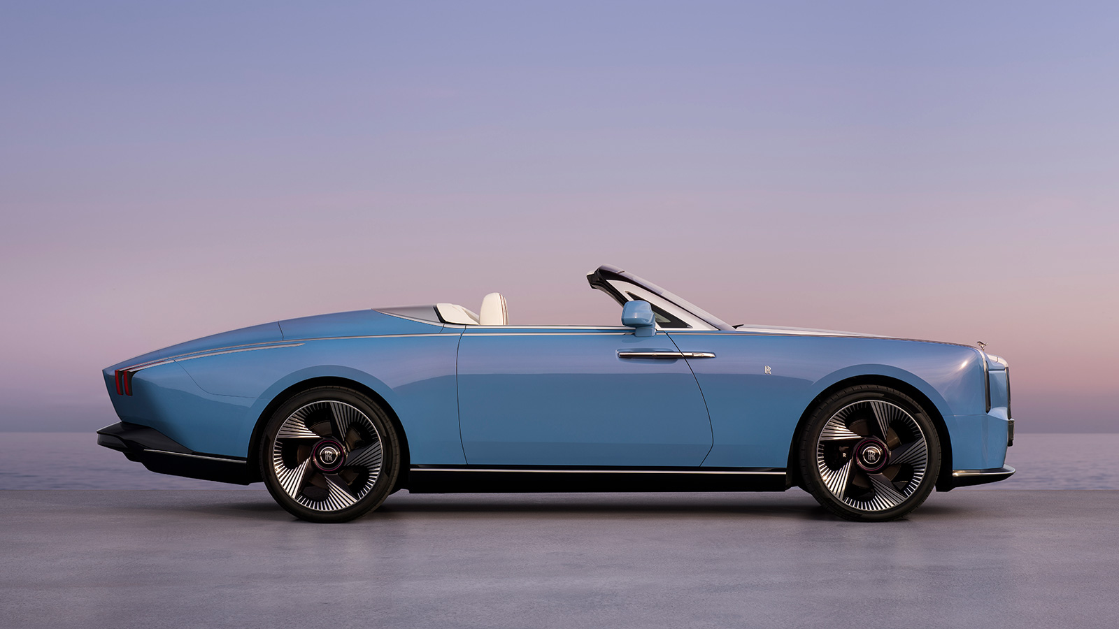 そのエクステリアは、シルバーのコンバーチブル・ソフトトップ・ルーフで仕上げられている。インテリアの色彩は、コート・ダジュールの穏やかな雰囲気を感じさせる。シートは、柔らかなパステル調のチャールズ・ブルーで仕立てられ、グレース・ホワイトとの組み合わせにより、やさしく陽光が差し込む落ち着いた空間を演出。深みのあるネイビーのシート・インサートがコントラストと奥行きを加え、フェイシアの周りやヘッドレストにはリヴィエラの野花に着想を得たピオニー・ピンクのアクセントが添えられている。全体の配色は、V字型に上方へ広がるオープンポアのブラックウッドで締めくくられ、視線を自然と空へと導く。