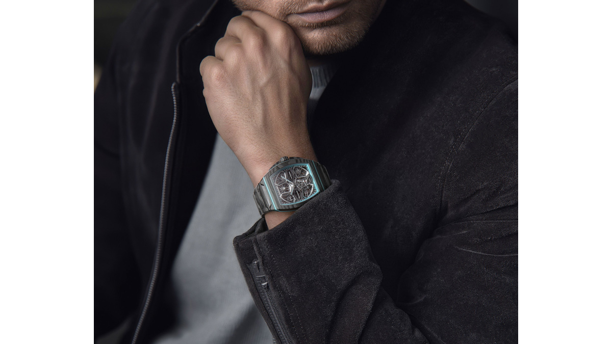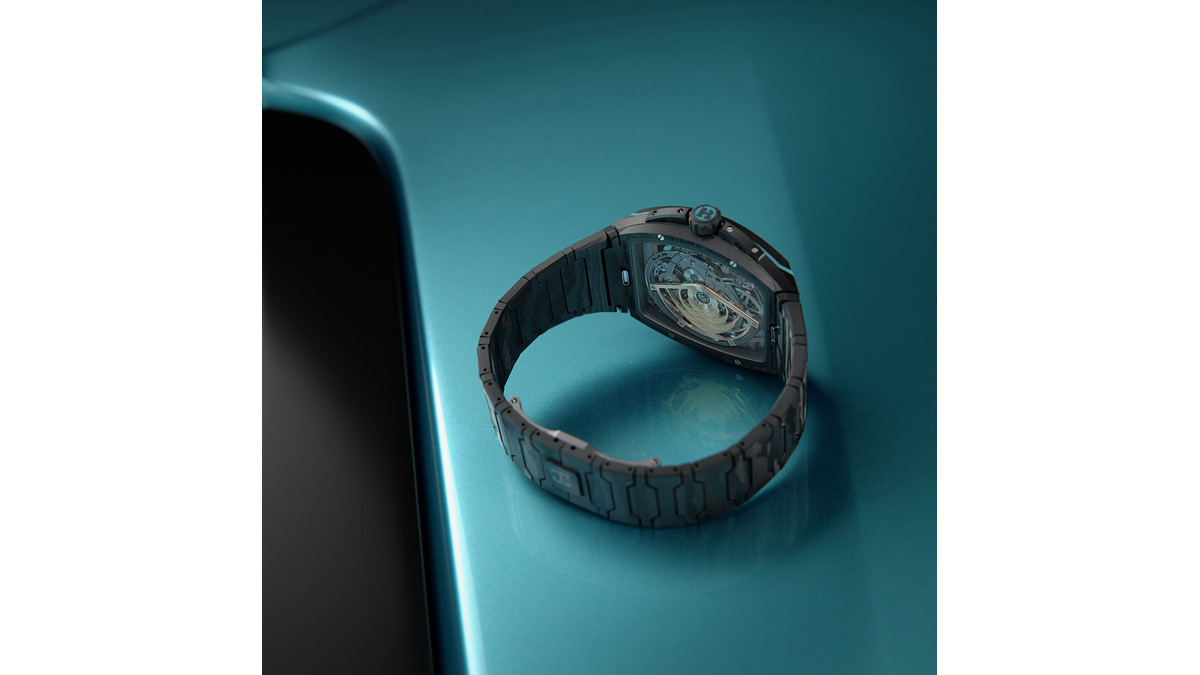 さらに、専用設計の巻き上げおよび時刻設定機構により摩擦を低減し、歯車列全体におけるエネルギー伝達効率を高めている。その結果、225個の部品と29石から構成されるムーブメントは、ケース厚9.9mmというコンパクトなサイズに収めることに成功した。ケースには高密度カーボンファイバーと加硫ラバーを採用し、手仕上げのリューズは一体型のカーボン製リューズガードによって保護されている。ベゼルおよびケースバックには無反射サファイアクリスタルを採用し、防水性能は5気圧を確保した。