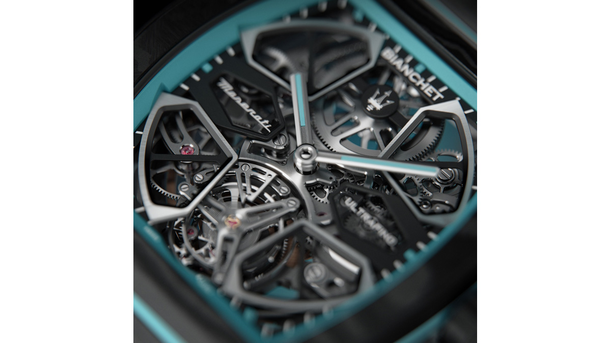 また、グッドウッドで「MC プーラ」に初採用されたエクステリアカラーの「AI Aqua Rainbow」は、マセラティのフォーリセリエ(フトゥーラ コレクション)に属する色であり、本モデルではダイヤルに取り入れられるとともに、ケースのラバーシームに沿ってアクセントとして施されている。これにより、走行時の車両が生み出すようなプリズムの奥行きを手元で再現した。グレード5チタン製のブリッジおよびメインプレートと、高密度カーボンによるケースとブレスレットは、「MC プーラ」のカーボンファイバーシャシーを想起させる。さらに、オープンに可視化されたフライング・トゥールビヨンケージは、ネットゥーノエンジンの鼓動を思わせる存在として表現されている。「MC プーラ」がカーボンファイバーシャシーによって高いねじり剛性を確保しつつ路面からの衝撃を吸収するのに対し、「ウルトラフィーノ マセラティ」は機械式時計における衝撃という同様の課題に向き合っていた。バランスホイールおよび構造レベルの双方に専用の耐衝撃機構を組み込むことで、最大5,000Gの負荷に耐える性能を実現。この卓越した性能は、「MC プーラ」のサスペンション技術や電子制御トラクションマネジメントと直接的に呼応している。