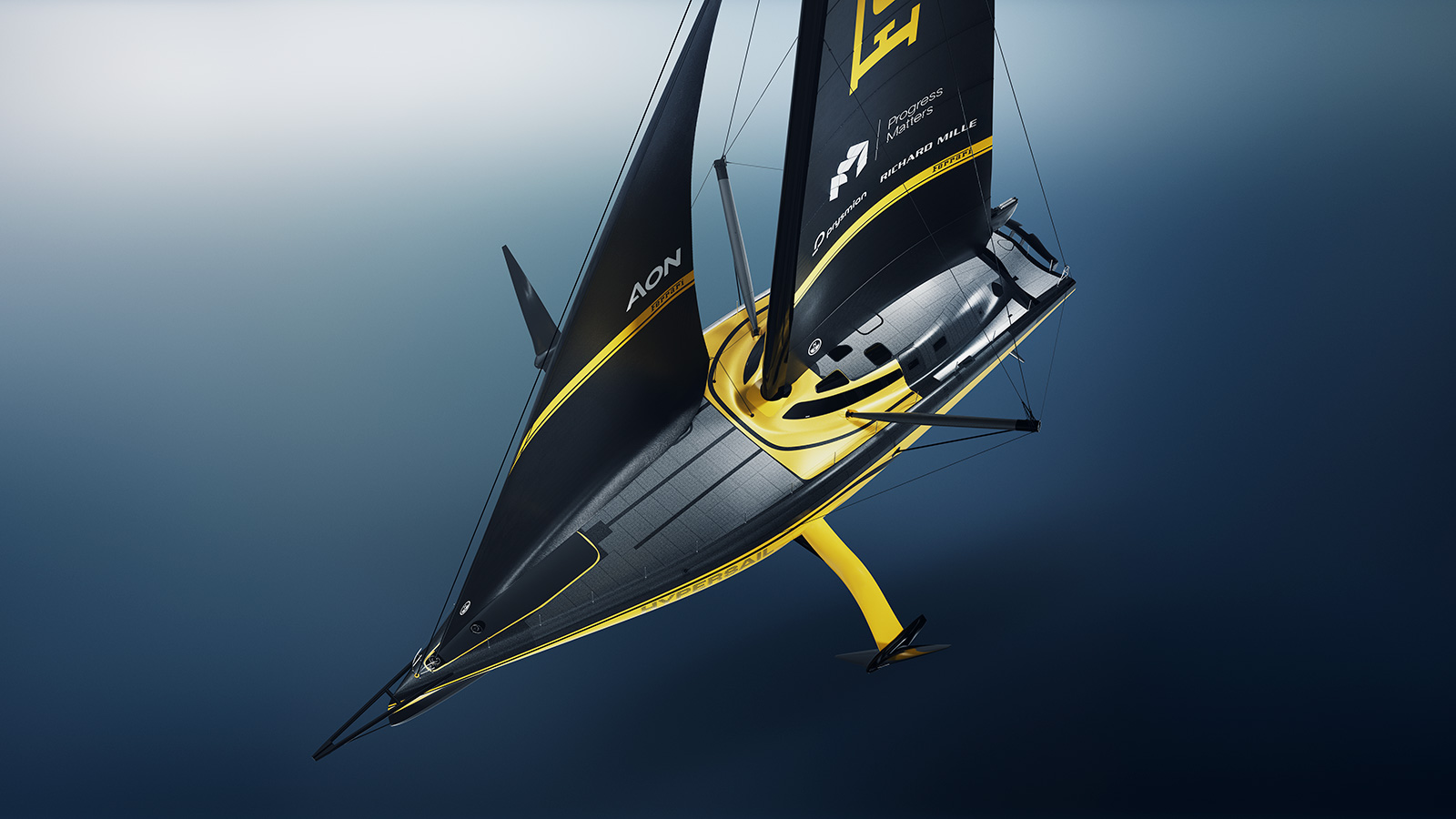 同プロジェクトにおいて、Grigio Hypersailと象徴的なNuovo Giallo Flyの相互作用は、美しさと機能性を兼ね備えたデザインを生み出している。キャビン、フォイル、船体ラインに施された黄色は、最も象徴的なフェラーリモデルのスタイルコードを想起させ、ブランドDNAを強く表現するとともに、初の「統合型」リバリーである512BBのカラー分割を想起させる。船体から、近年見られる特徴的な細長い「F」のビジュアル(2023/2024年型F1マシンのウィング、ライフスタイル製品、ペブルビーチのチャリティーオークションに寄贈されたデイトナSP3など)との連続性を確保するために導入されたセイル上のフェラーリのロゴから、さらにLaFerrariやF80のラインに着想を得たディテールに至るまで、Hypersailは外洋セーリングにおけるデザインと機能の新たなパラダイムを提示している。