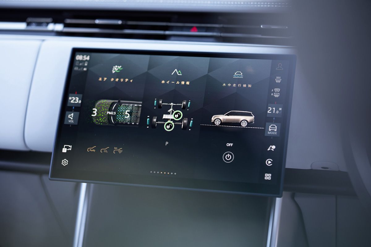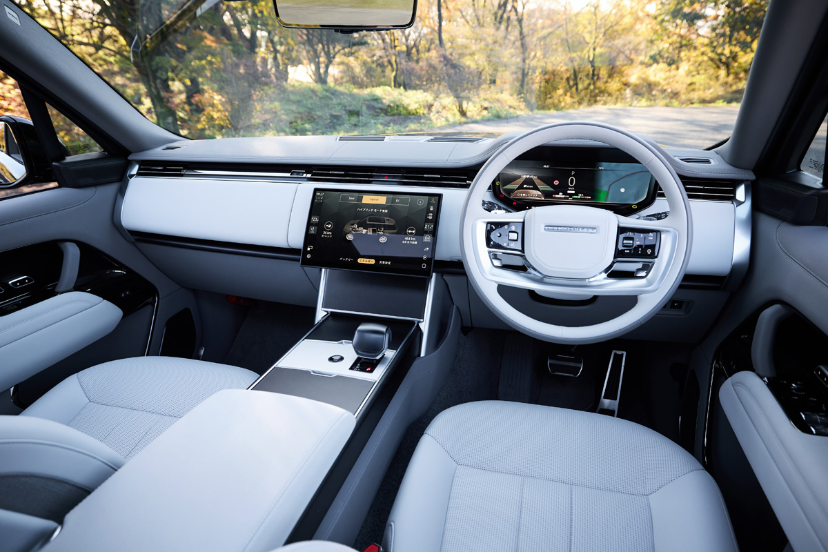 スターターボタンを押しても、キャビンは静寂を保ったまま。直列6気筒ガソリンターボエンジンと電動システムを組み合わせたこのプラグインハイブリッド(PHEV)ユニットは、発進時はモーターだけで動き出す。3トン近い車体が、まるでその重さを忘れたかのように滑らかに進む。その所作が驚きである。ラグジュアリーと電動化。かつては異なる価値だった2つが、今、この一台の中で完璧に調和している。55年にわたり磨かれてきた〝上質の哲学〟が、静かな加速の中に息づいているのだ。エンジン音ではなく、空気の静けさの中に力を感じる。それこそが、レンジローバーという存在が放つ唯一無二の魅力である。