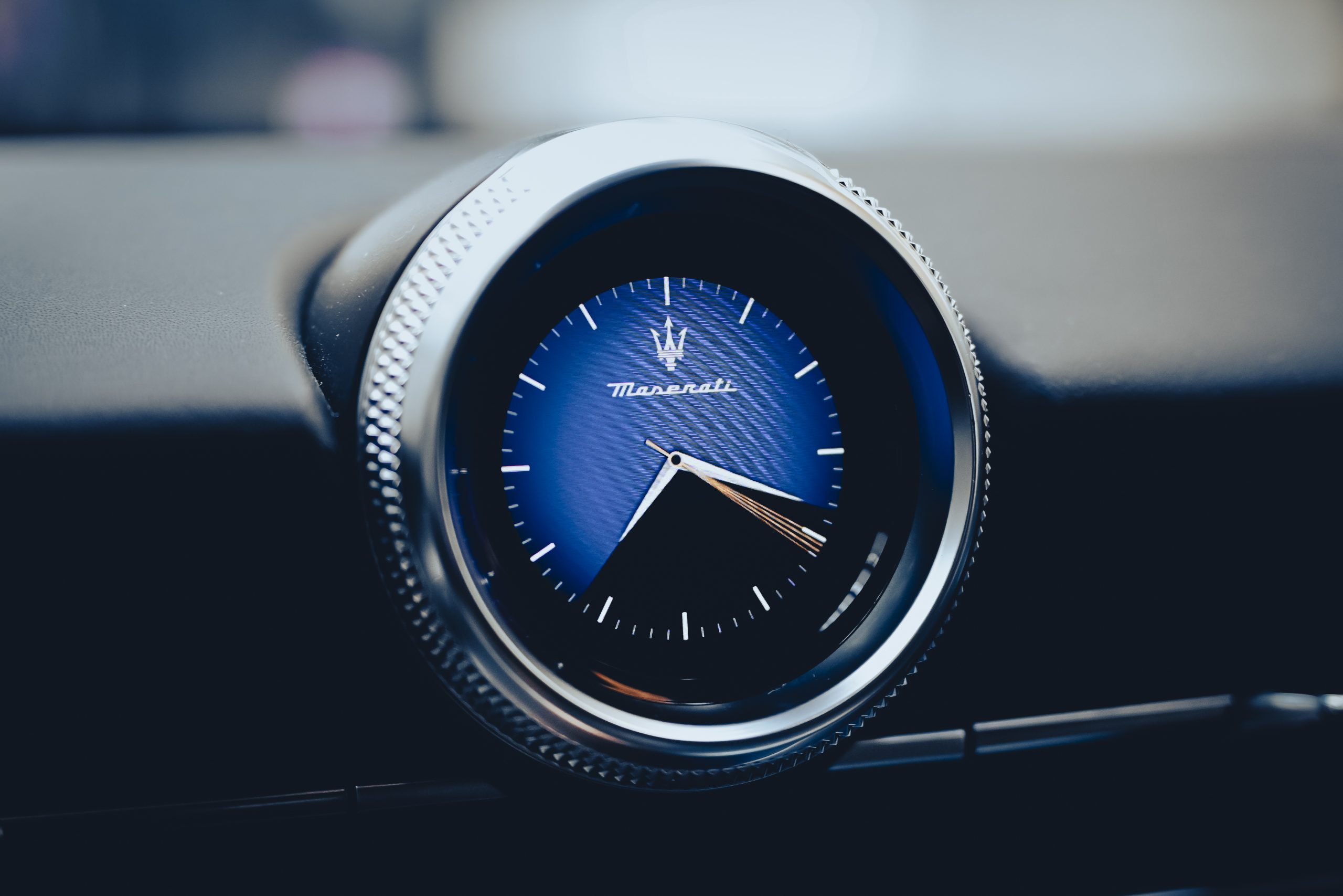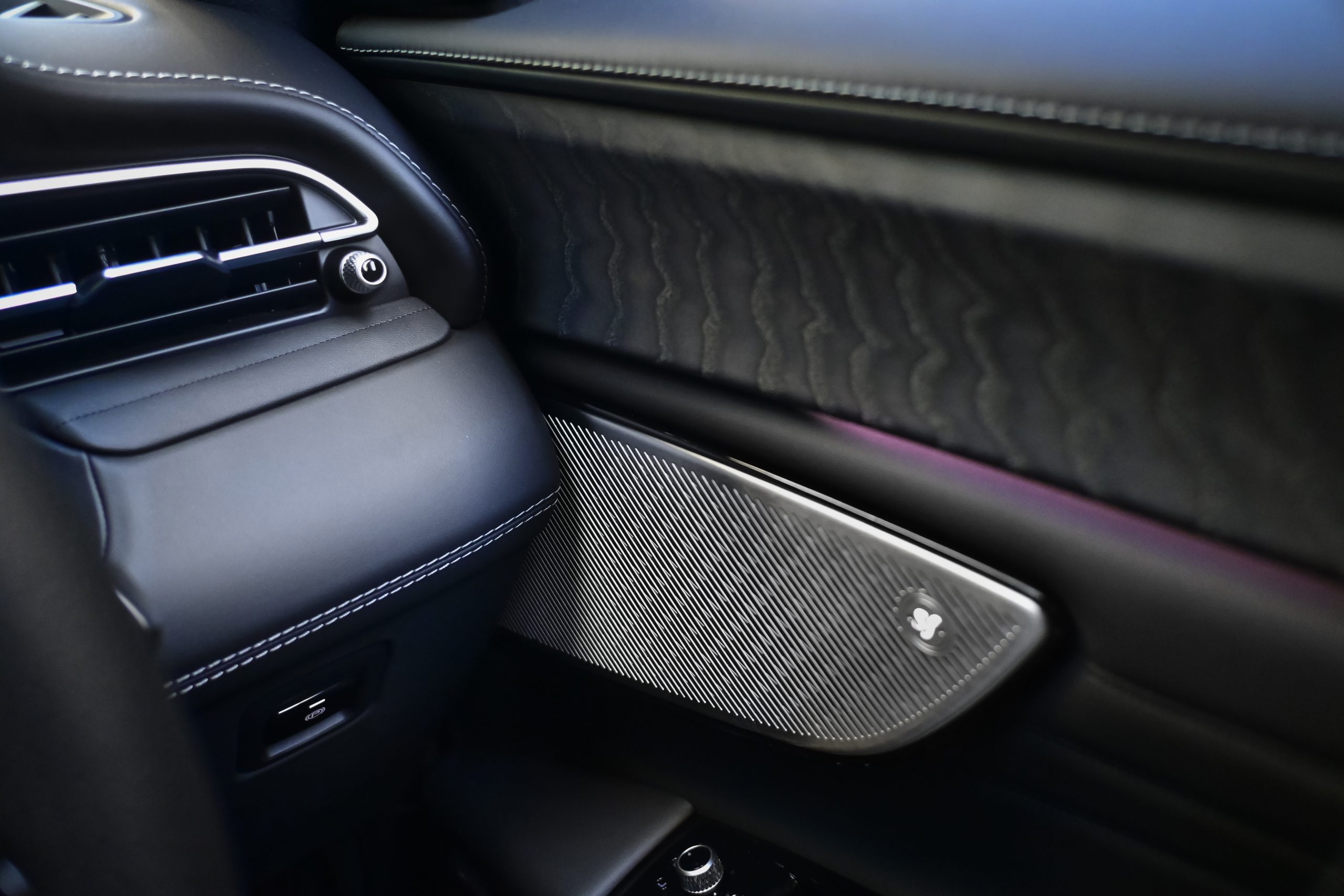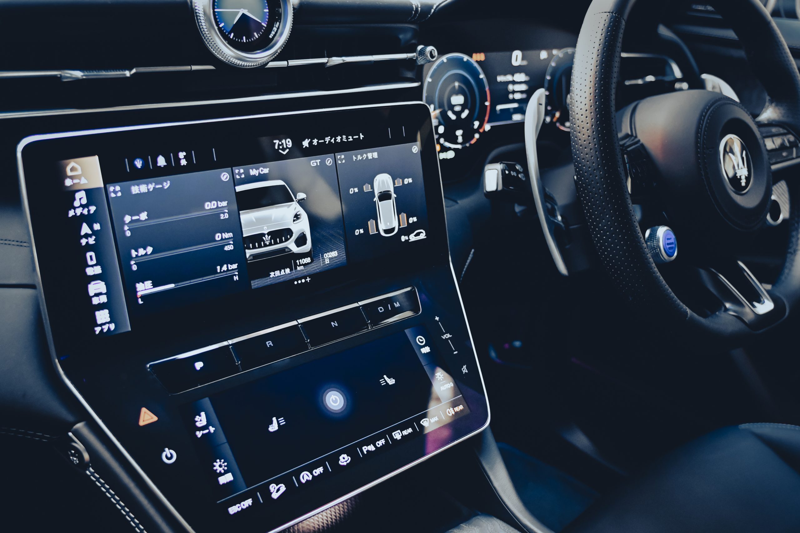 電磁ラッチを採用したドアを開け、コクピットにつく。ダッシュボード中央の最も視線を集める位置には、トライデントをあしらった時計が鎮座。これは歴代マセラティに脈々と受け継がれてきたアイコンだ。その下にはコンケーブ形状のタッチモニターが配され、操作系として機能する。周囲を包むのは、しっとりとした質感のフルプレミアムレザー。精緻なステッチワークが、丁寧な手仕事を雄弁に物語る。センターコンソールのウッドトリムや、金属感あふれるスピーカーカバー、そしてそれらを引き立てるアンビエントライトの演出も相まって、ベーシックモデルでありながら、これまで接してきた上級グレードとまったく遜色のない空間が広がっている。
